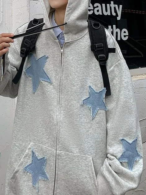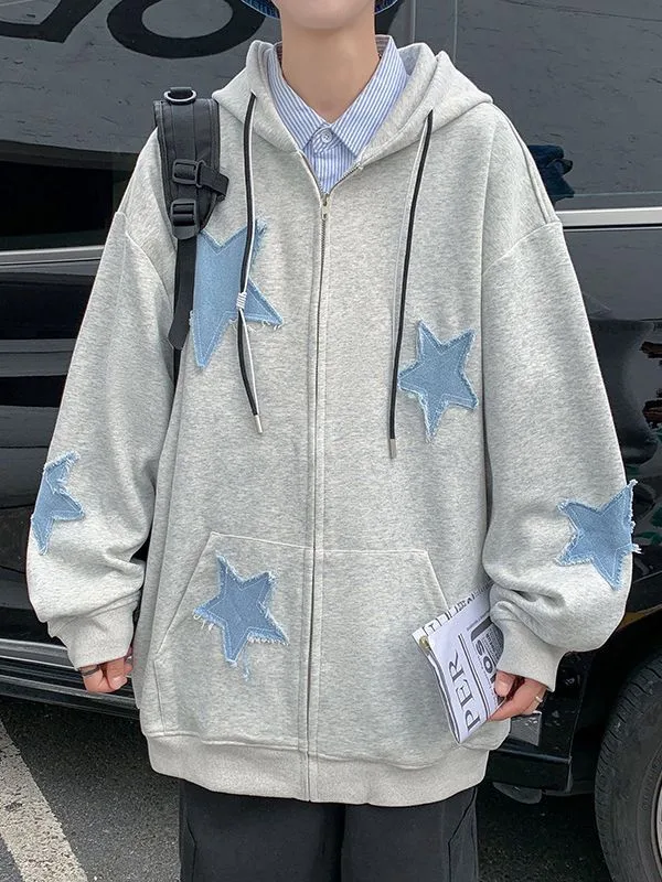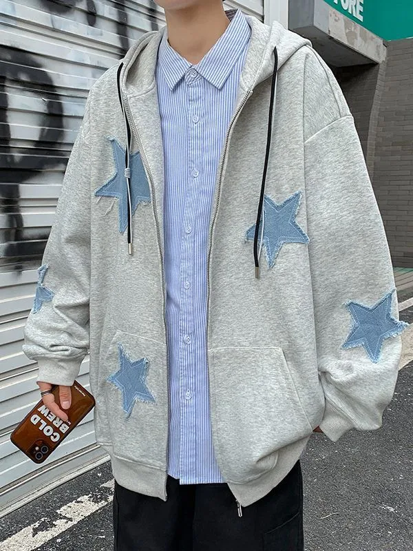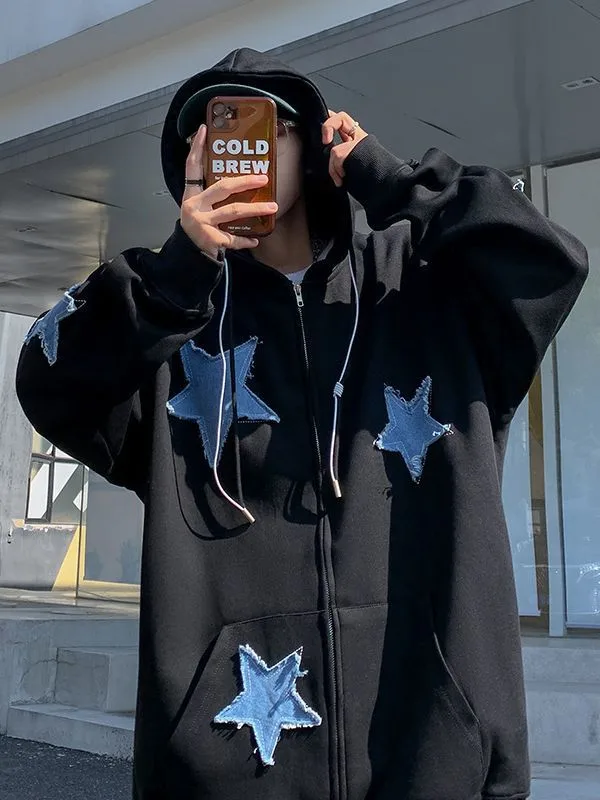 Cardigan Sweater Men's Ins Embroidered Stars Autumn And Winter Fashionable Loose Fleece-Lined Thickened Coat T