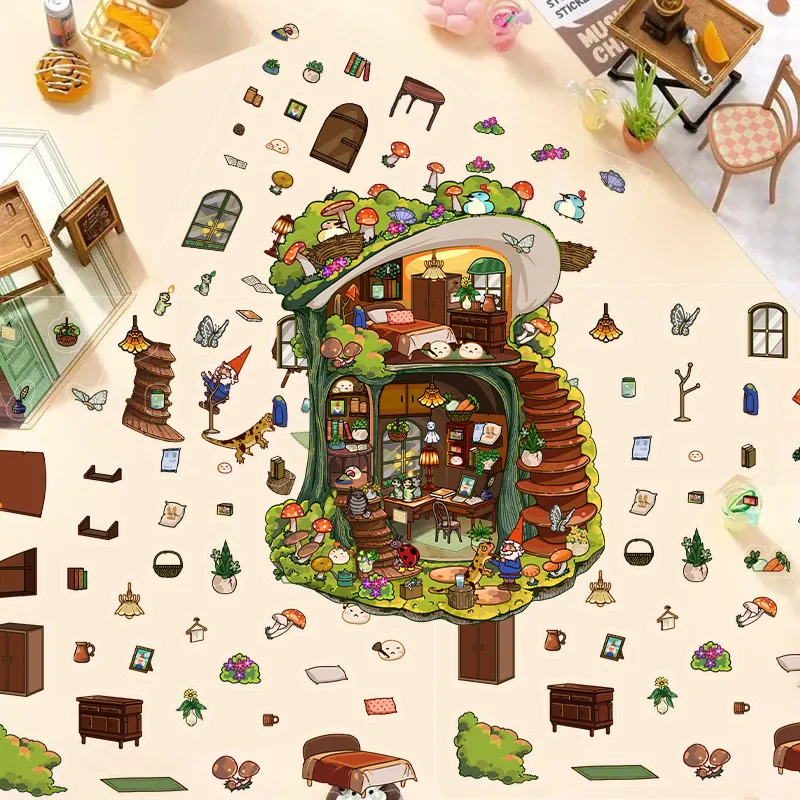 Cartoon Landscaping Mushroom Hut Sticker Miniature World 3D Hut Little Red Book Decompression DIY Scene Hand Account Sticker