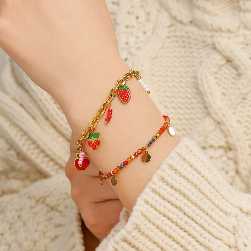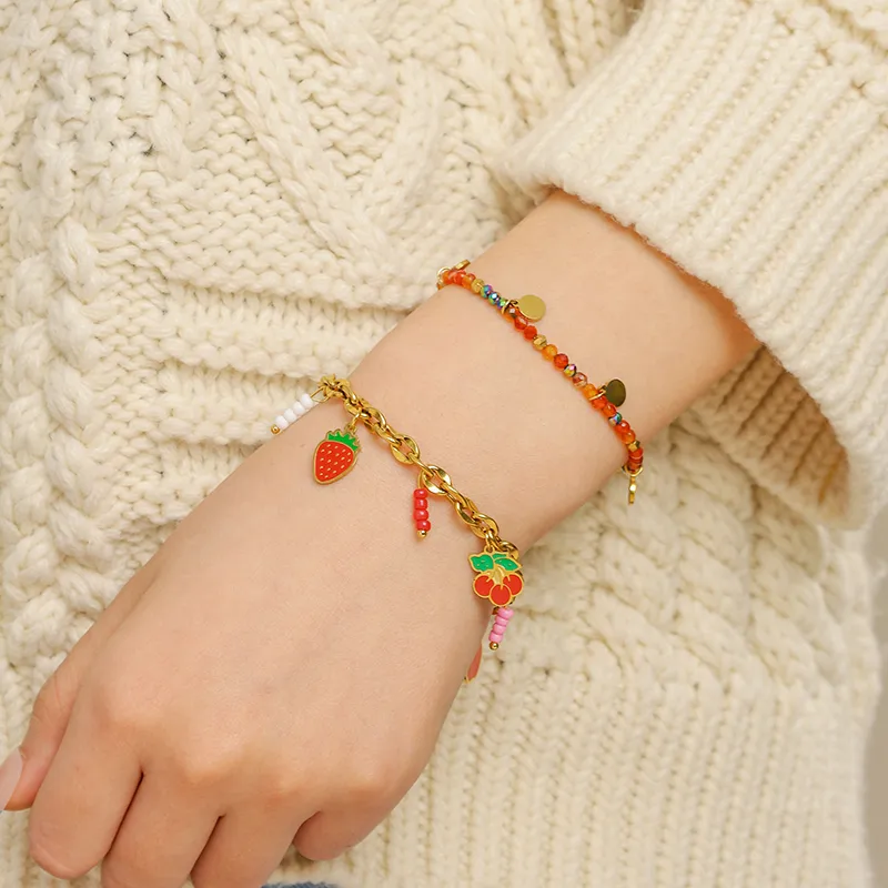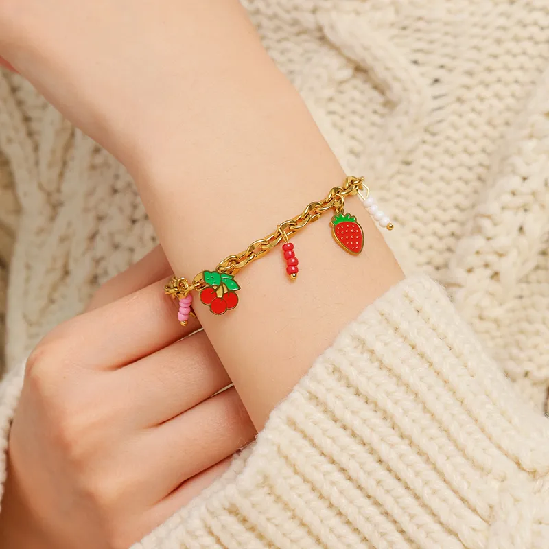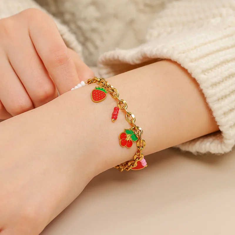 Wholesale Cartoon Style Cute Cherry Apple Strawberry 304 Stainless Steel Enamel 14K Gold Plated Women's Multi Charms Bracelet