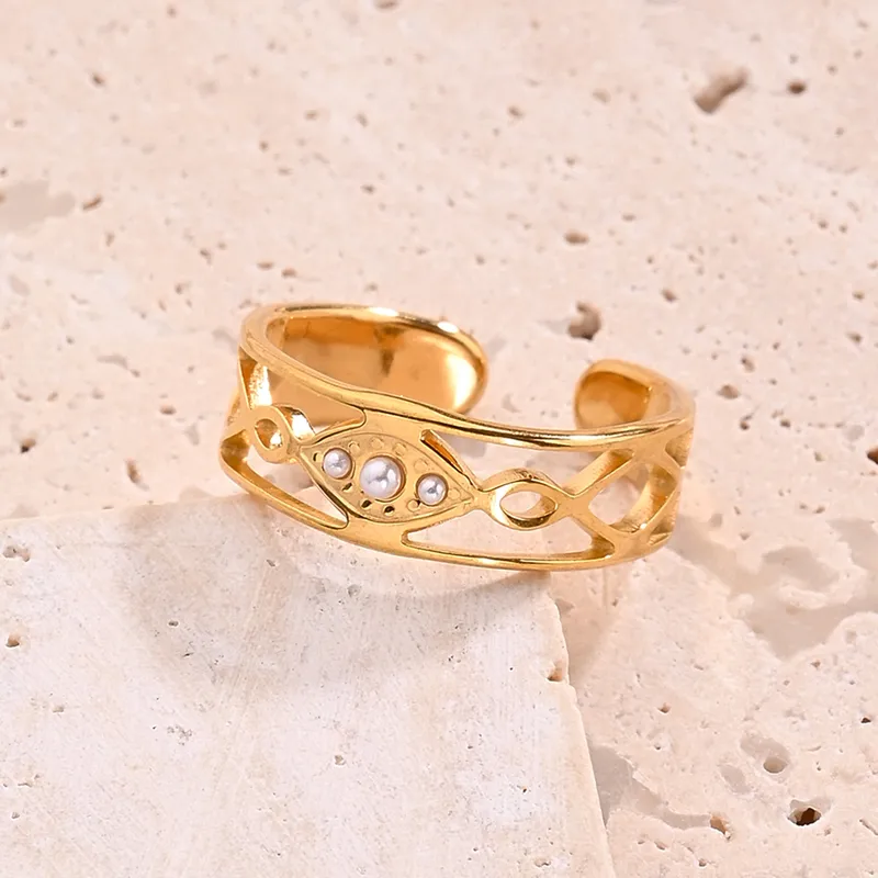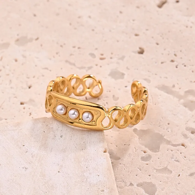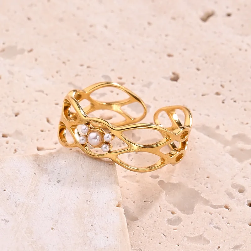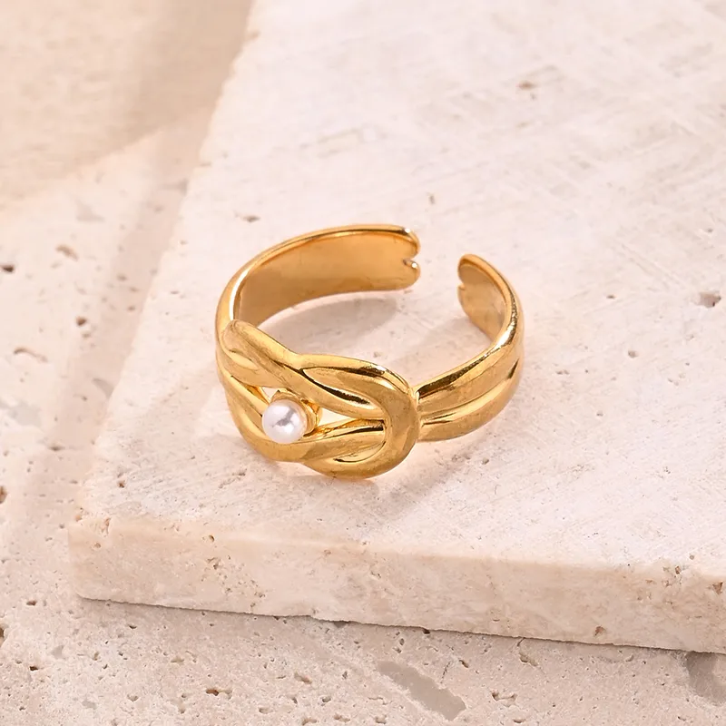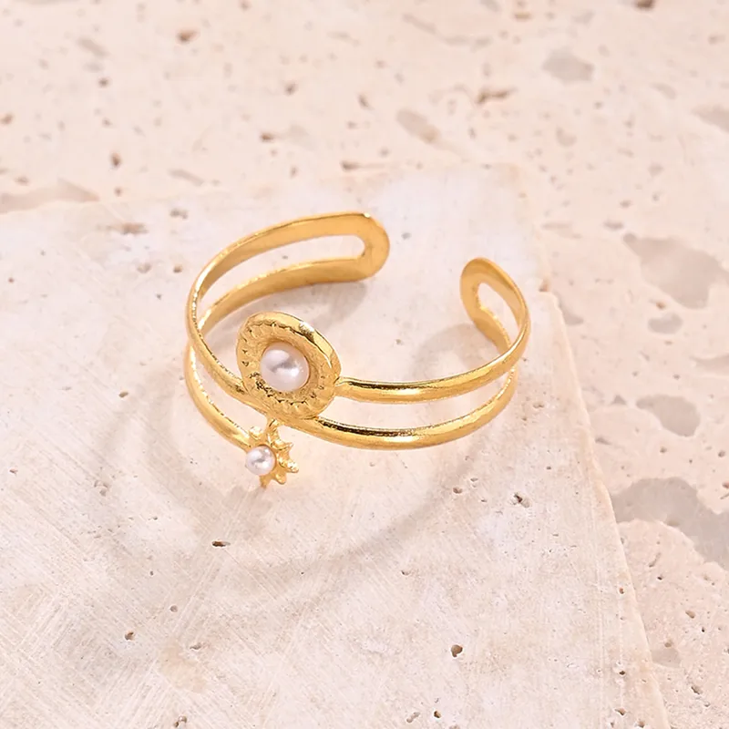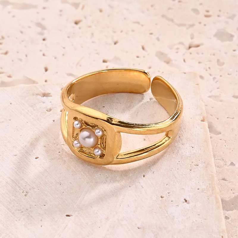 Wholesale Casual Modern Style Simple Style Sun Square Knot 304 Stainless Steel Handmade Polishing Inlay Imitation Pearl 18K Gold Plated Women's Adjustable Ring