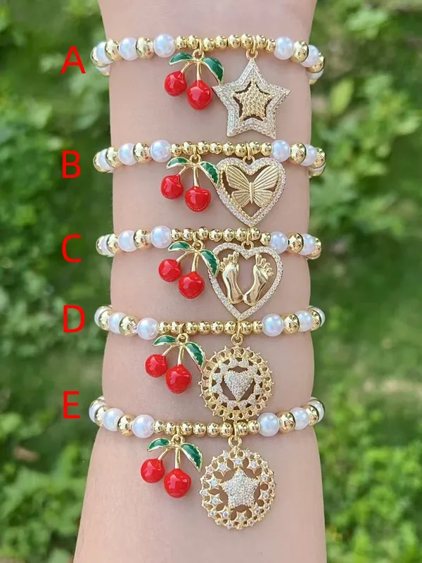 Casual Vacation Simple Style Star Cherry Heart Shape Acrylic Pearl Copper Enamel Hollow Out Inlay Zircon 18K Gold Plated Women's Bracelets