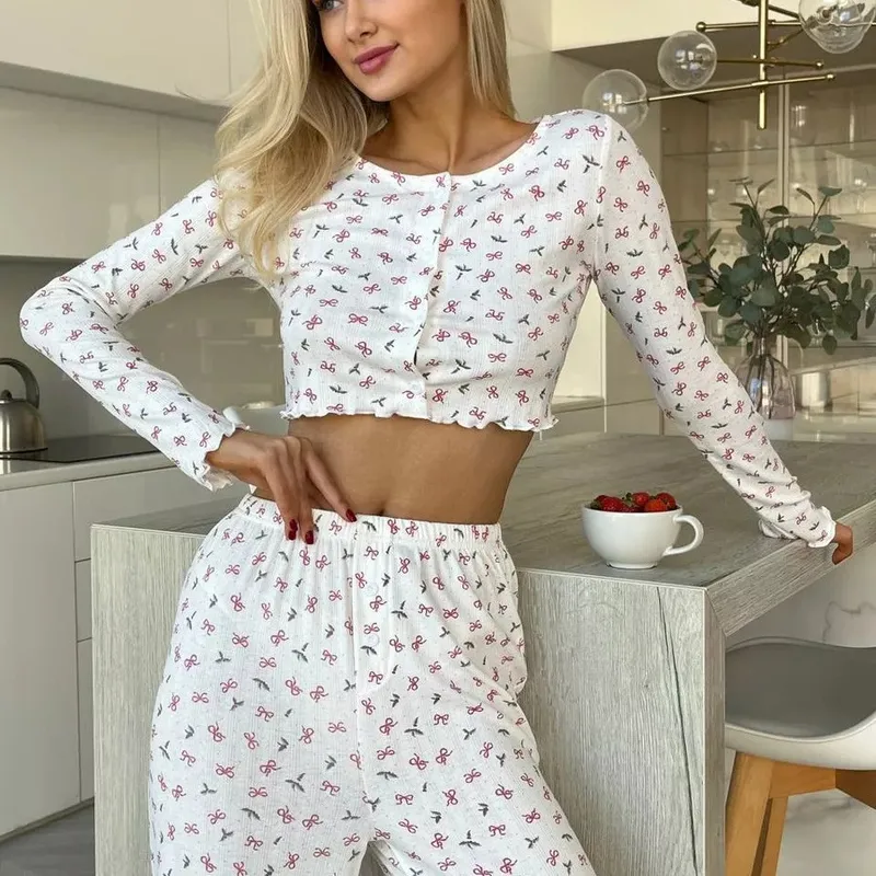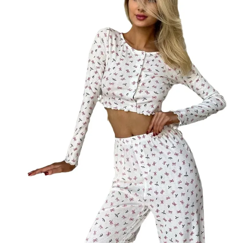 Wholesale Home Daily Women's Casual Cute Flower Bow Knot Artificial Cotton Spandex Polyester Pants Sets Pajama Sets