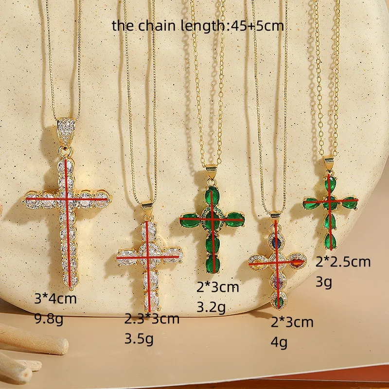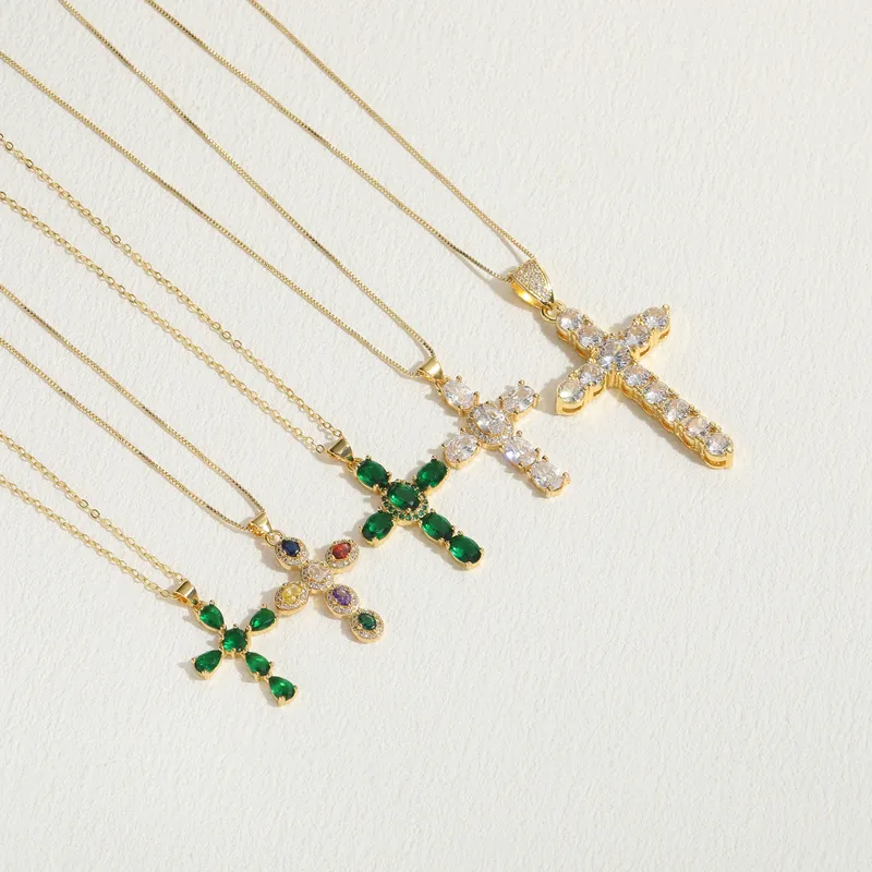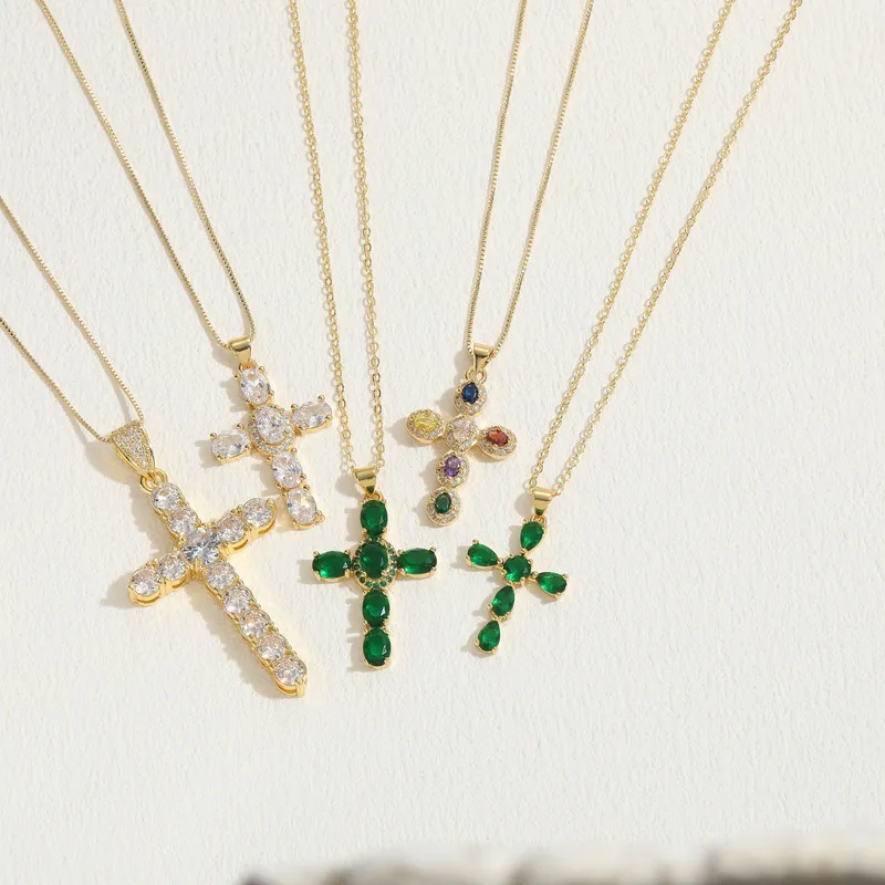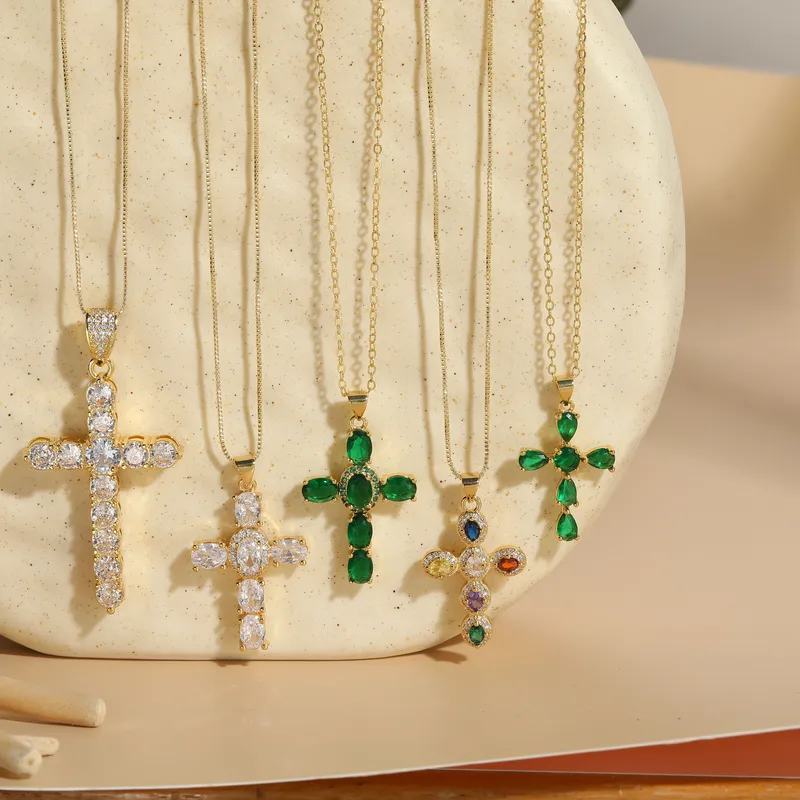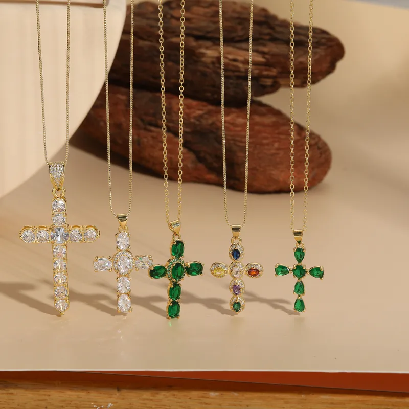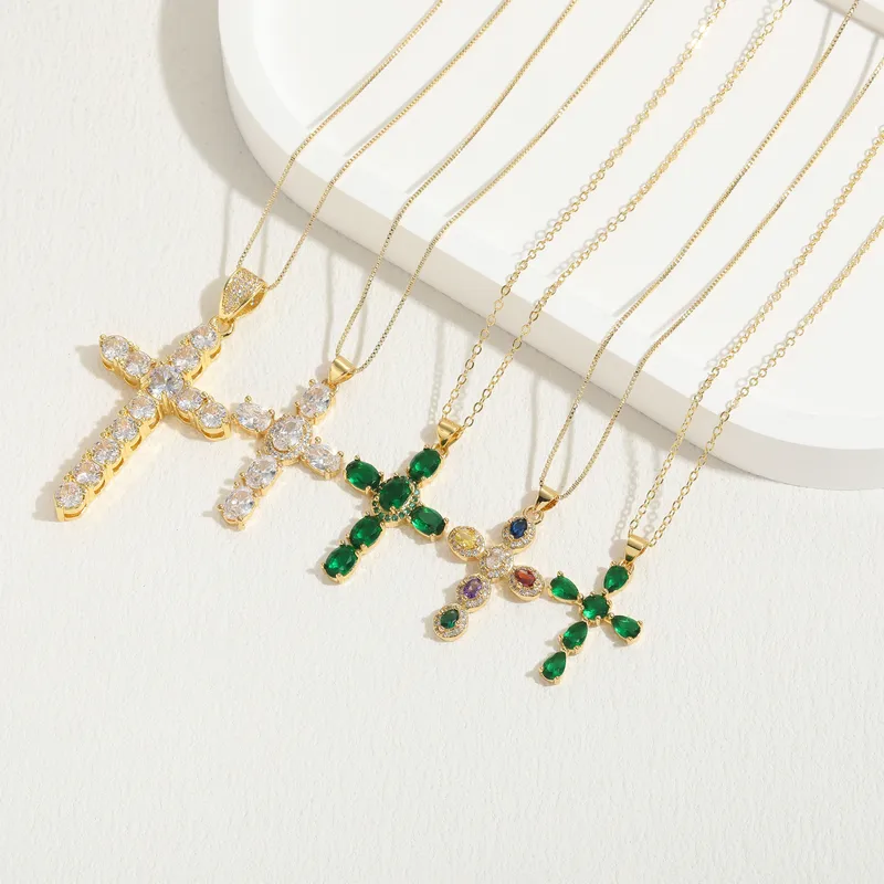 Wholesale elegant luxurious classic style cross copper irregular plating inlay zircon 14k gold plated pendant necklace
