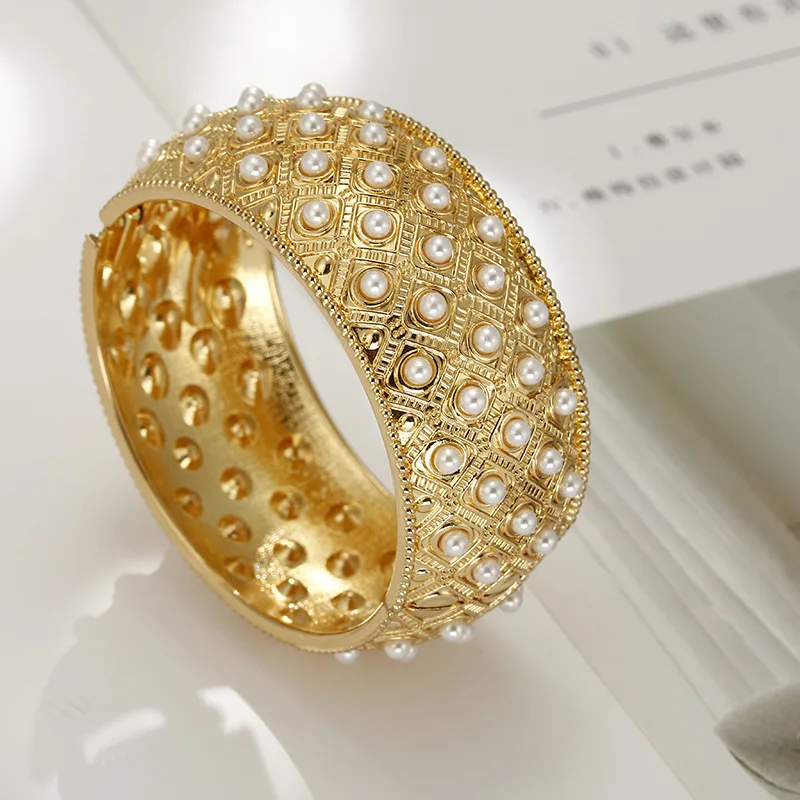 Wholesale elegant luxurious solid color alloy plating inlay artificial pearls women's bangle
