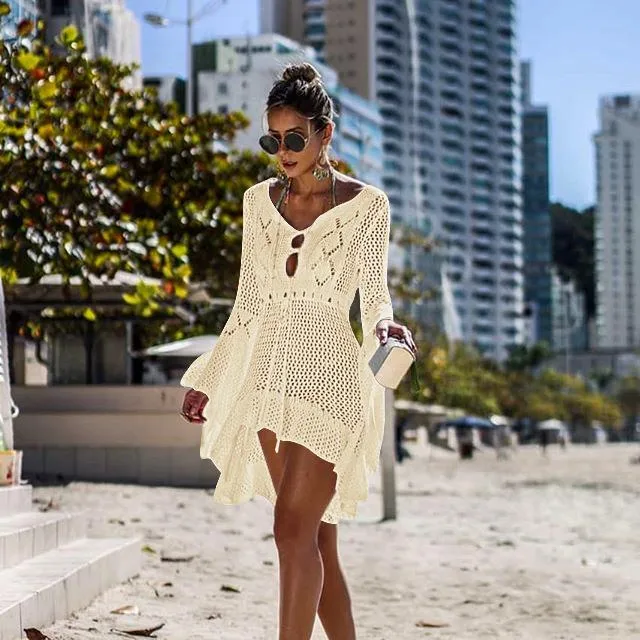 European And American New Hollow-out Knitted Dress Bell Sleeve Beach Jacket Sexy Bikini Blouse Sun Protection Clothing Swimsuit Outwear
