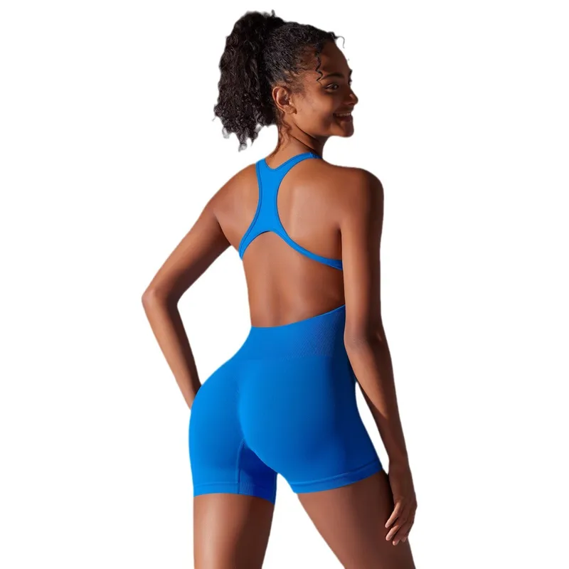 Fitness Solid Color Nylon Cotton Blend U Neck Backless Tracksuit Rompers