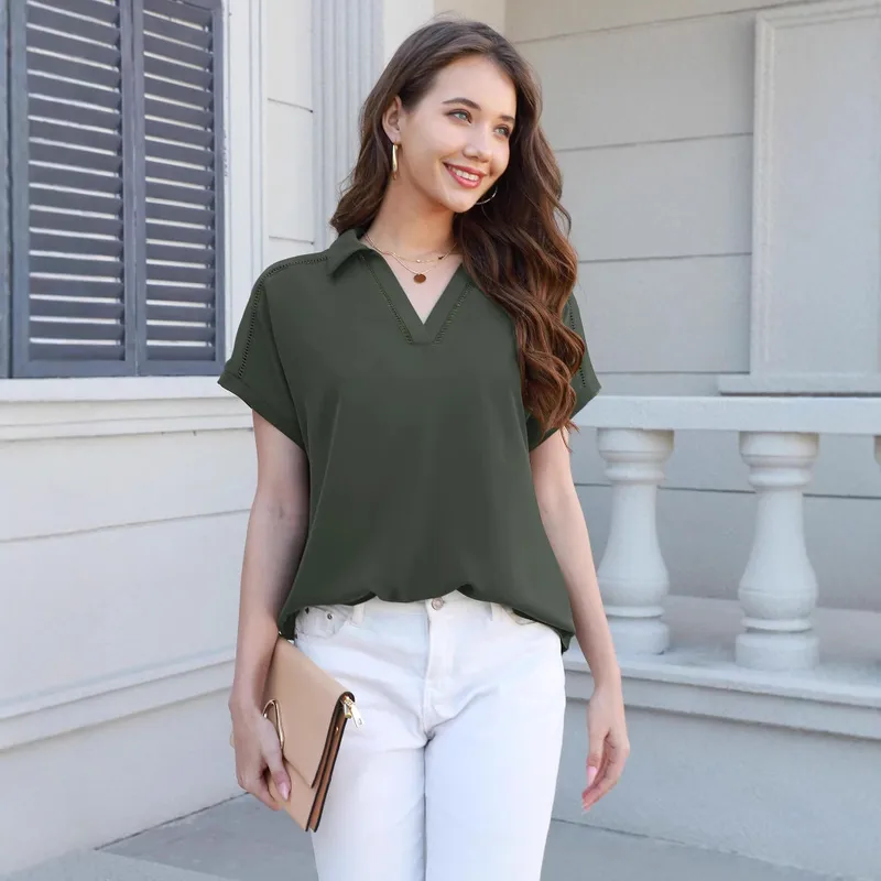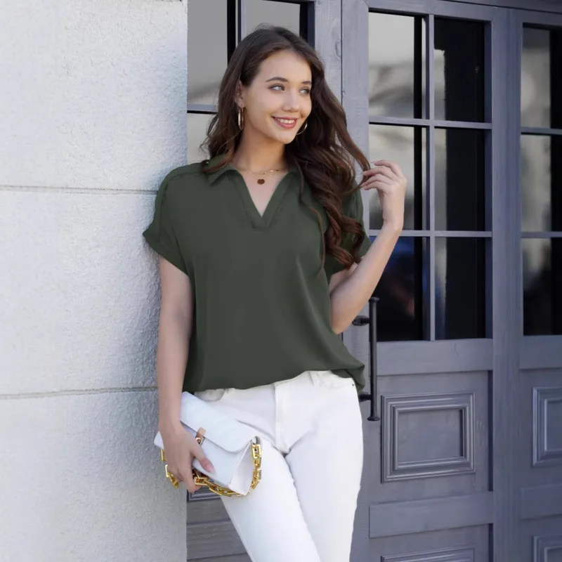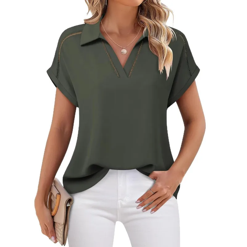 Foreign Trade New Solid Color Women's V-neck Short-sleeved T-shirt Casual Fashion Lace Top