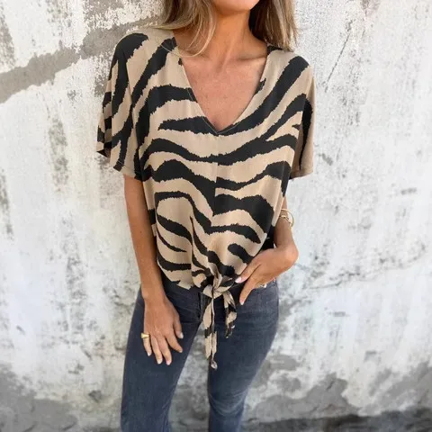 Wholesale Foreign Trade Spring and Summer New Women's V-neck Printed Lace-up Zebra Pattern Casual Short-sleeved Top