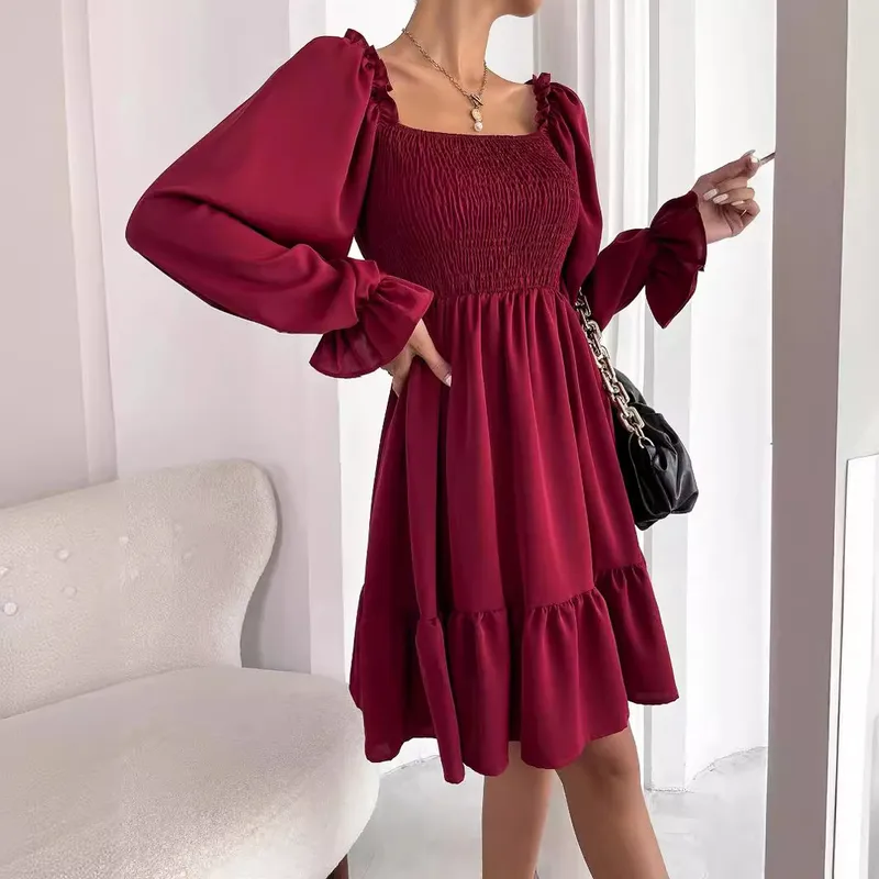 Wholesale French style simple square collar parallel crepe sewing body ruffled hem dress