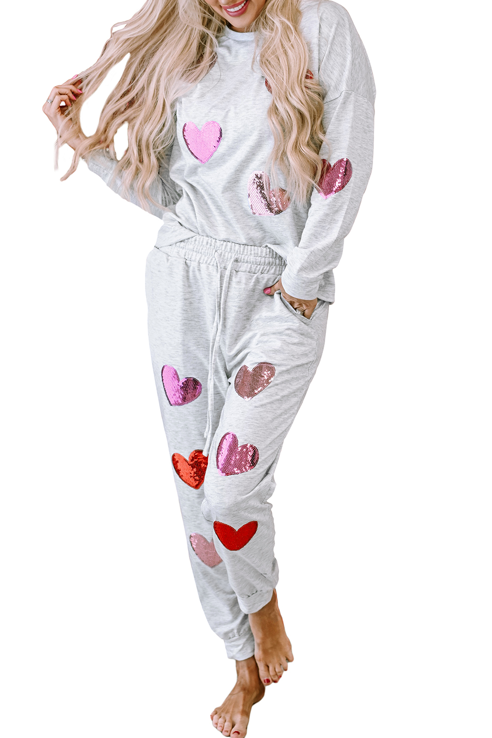 Gray Sequin Valentine Heart Pattern Pullover Jogger Pants Set