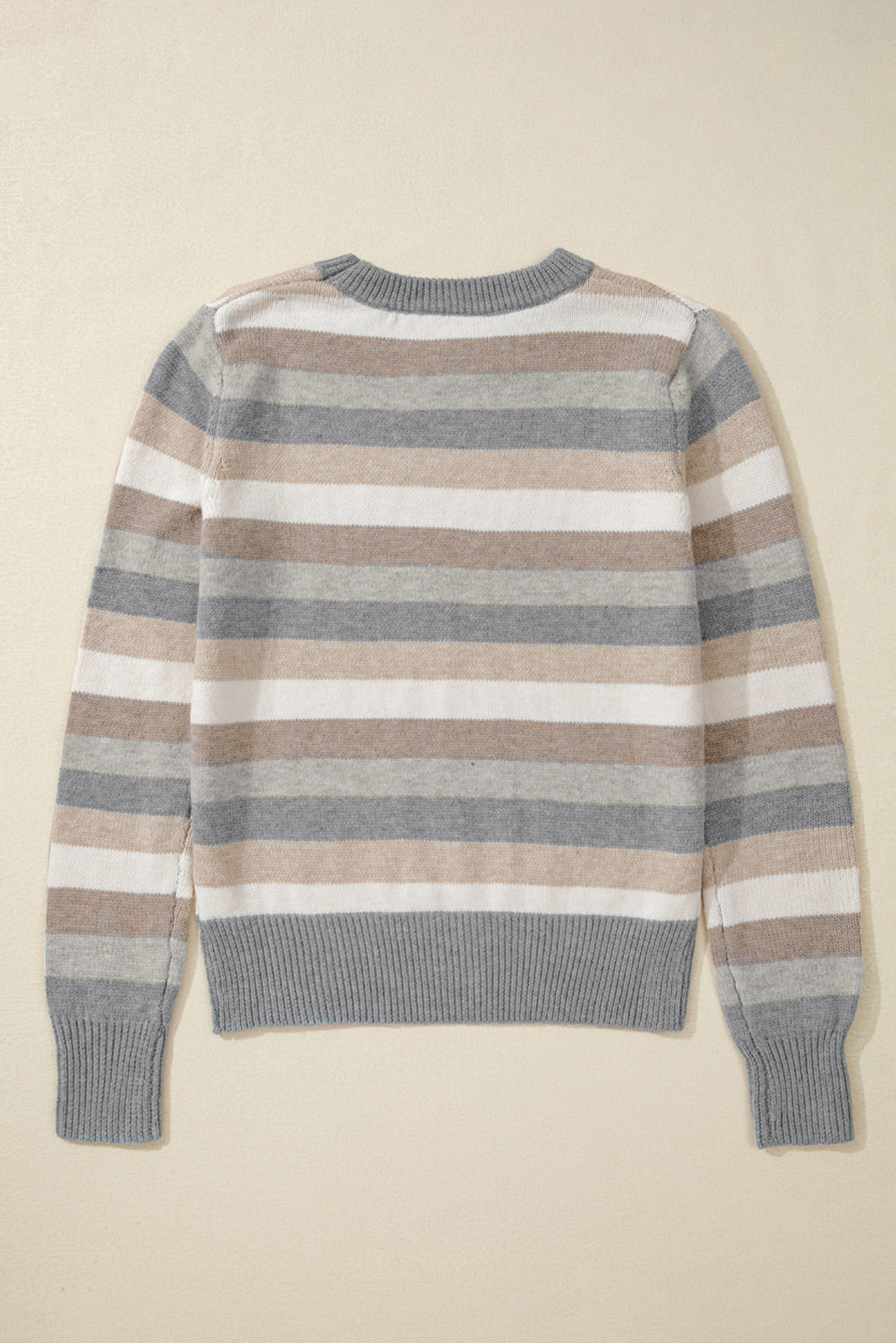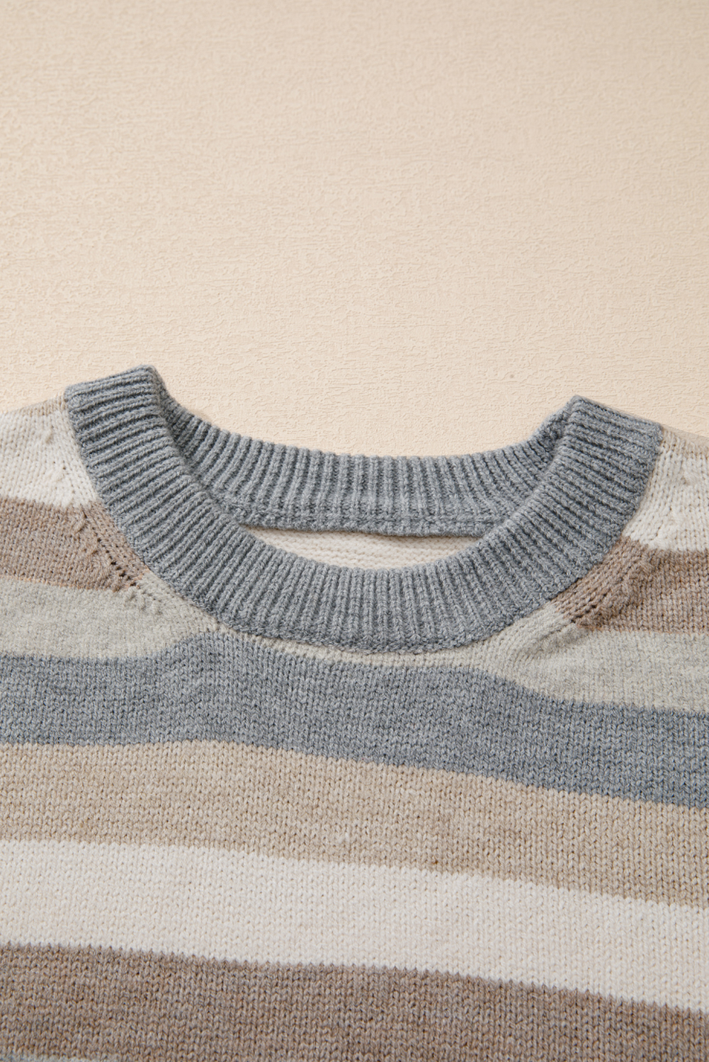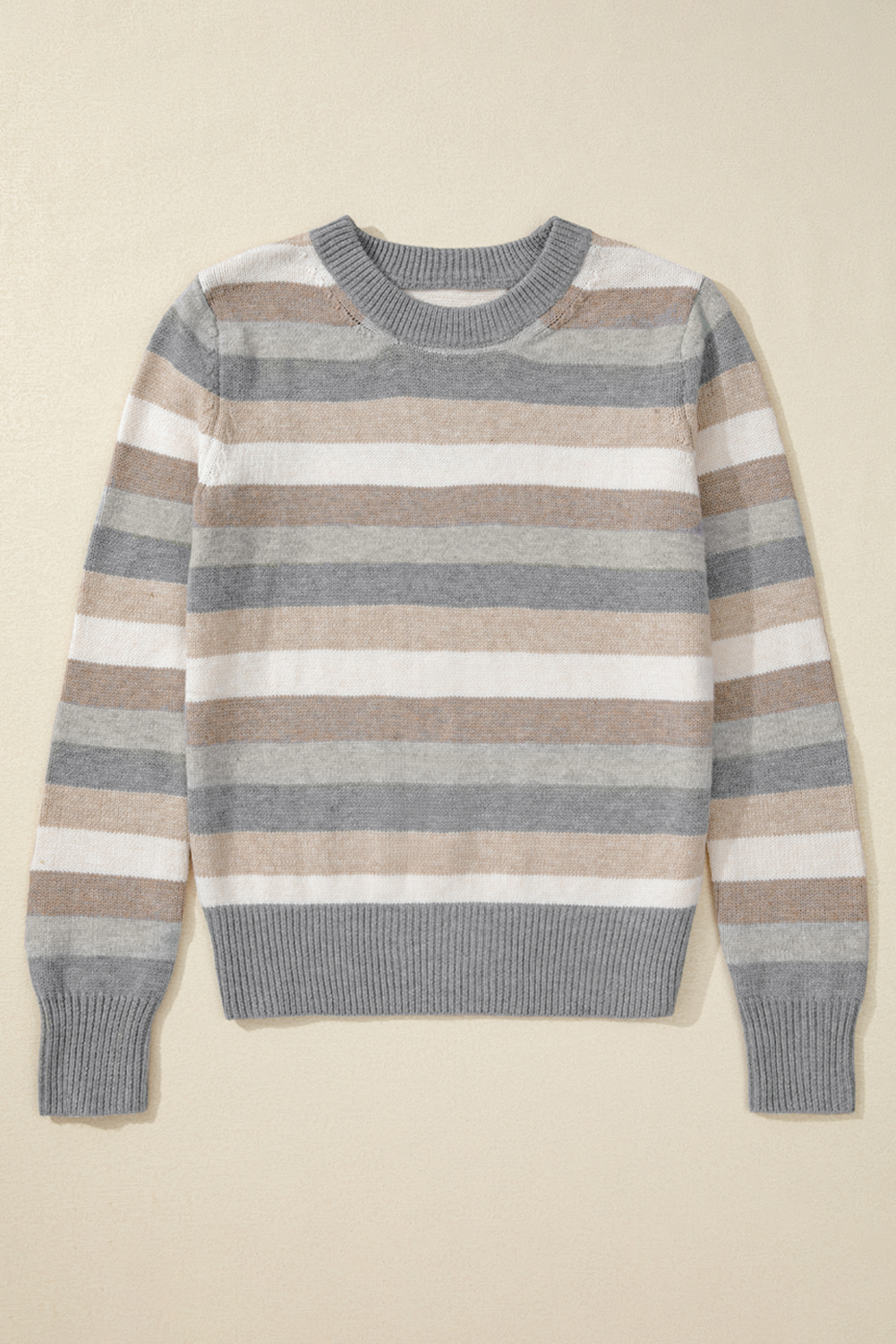 Gray Stripe Color Block Ribbed Edge Round Neck Sweater