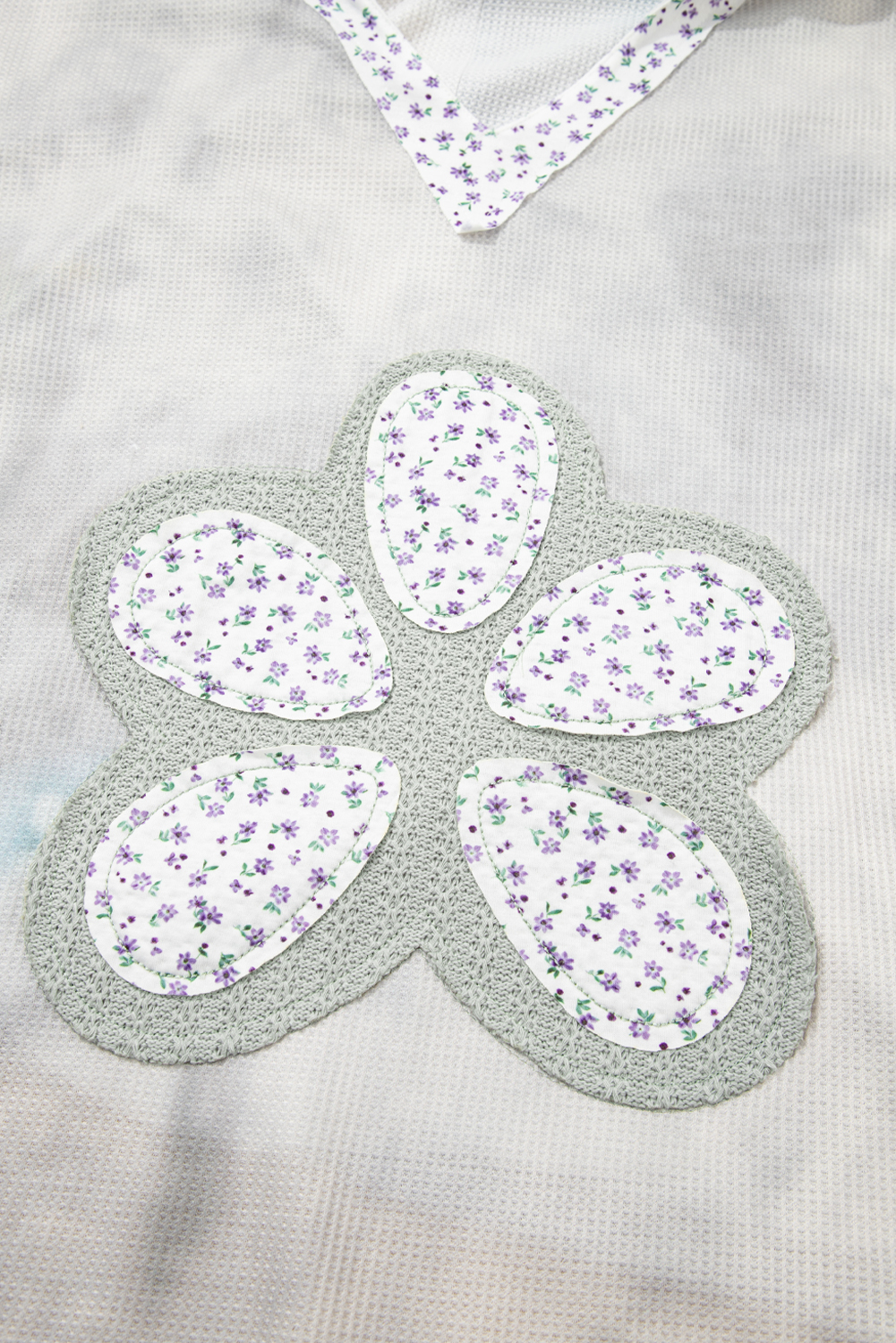 Green Floral Patched Waffle Textured Colorblock V Neck Casual Hooded Top