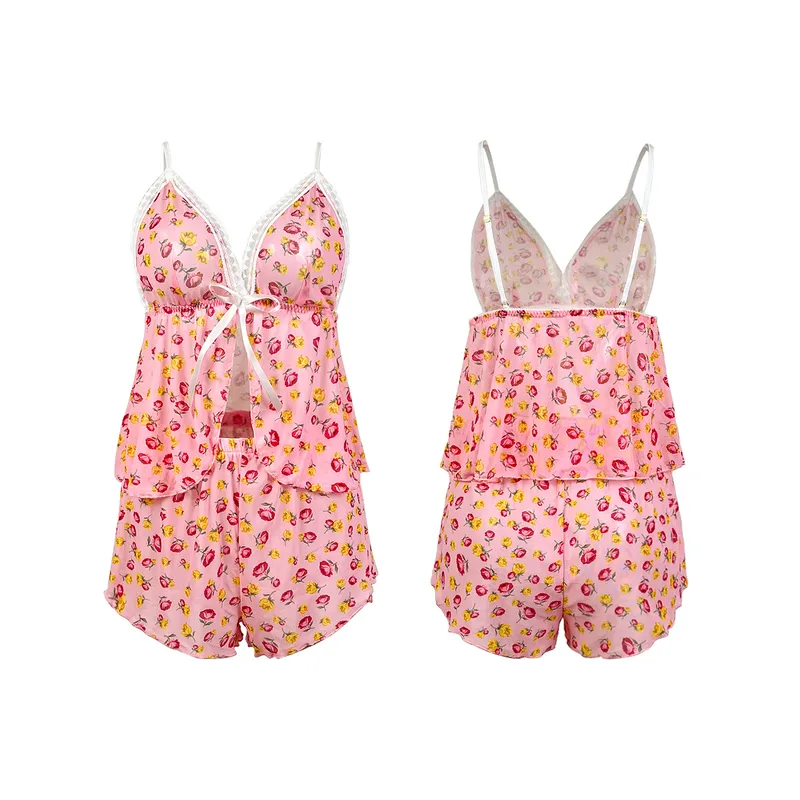 Wholesale home sleeping women's elegant lady flower polyester mesh yarn shorts sets pajama sets