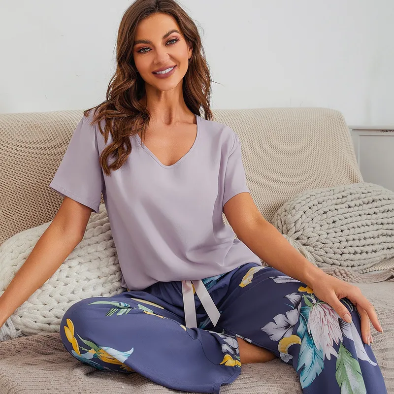 Wholesale Home Women's Elegant Flower Artificial Cotton Pants Sets Pajama Sets
