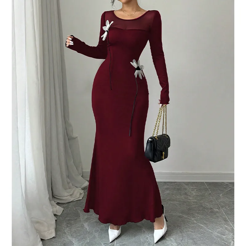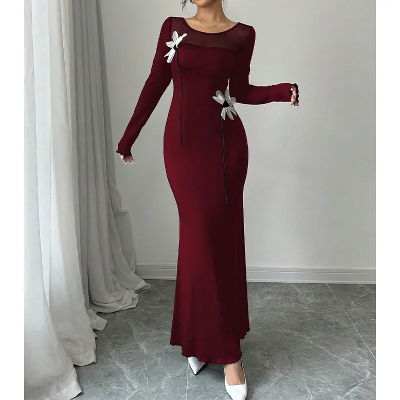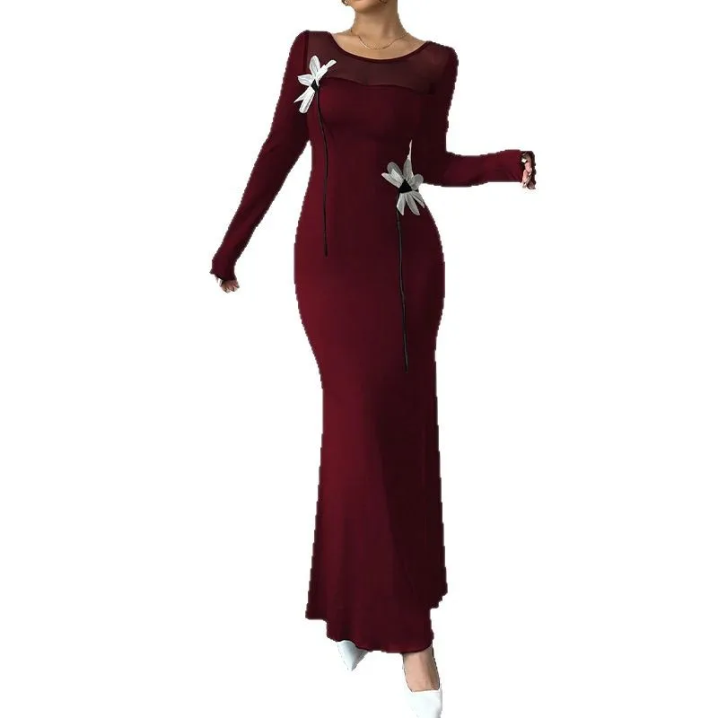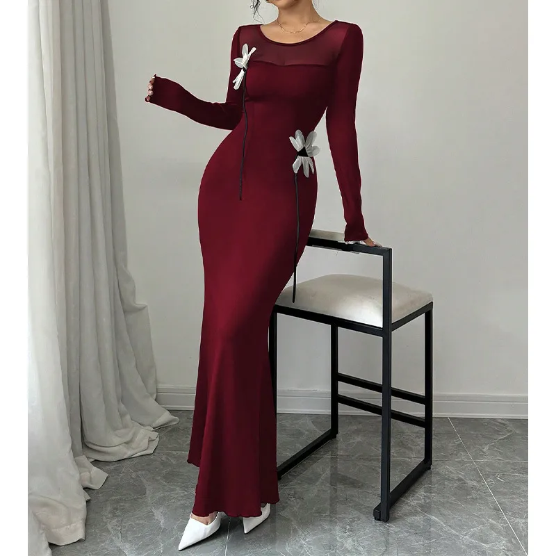 Wholesale Independent station spring and autumn new elegant flower ribbon decoration slim hip dress sexy long dress