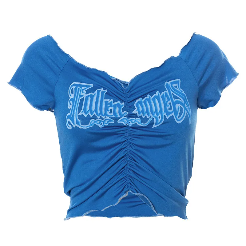 Ins Summer New Pullover Pleated Printed Ear Edge Navel Casual Women's T-shirt Sexy Short-sleeved Top