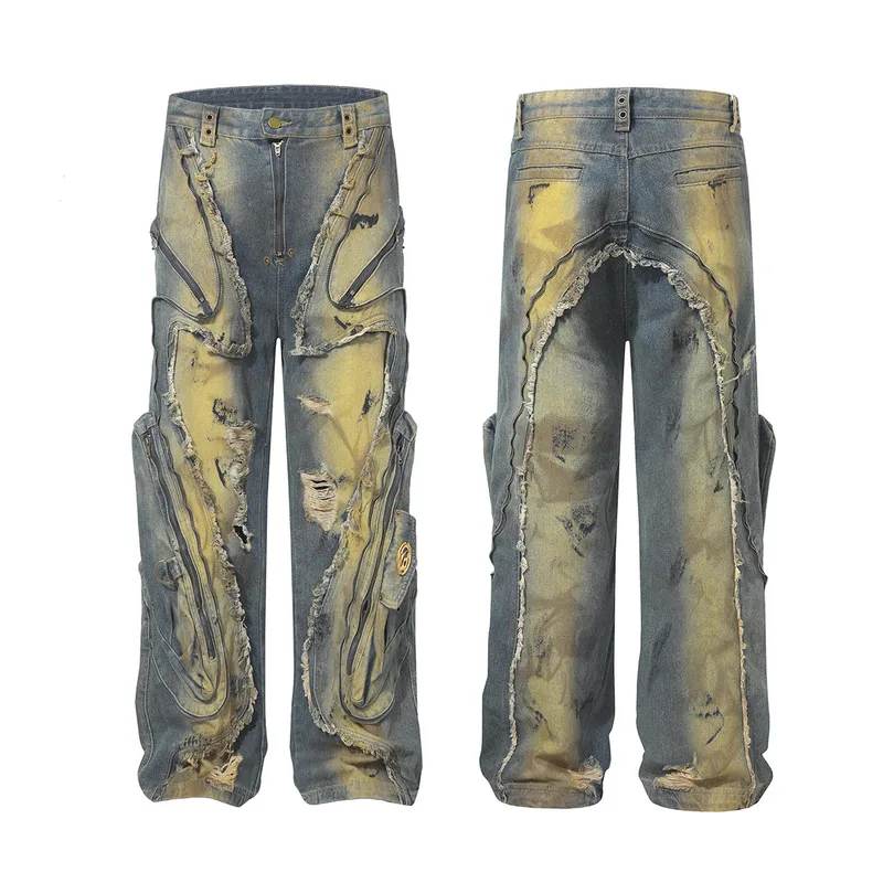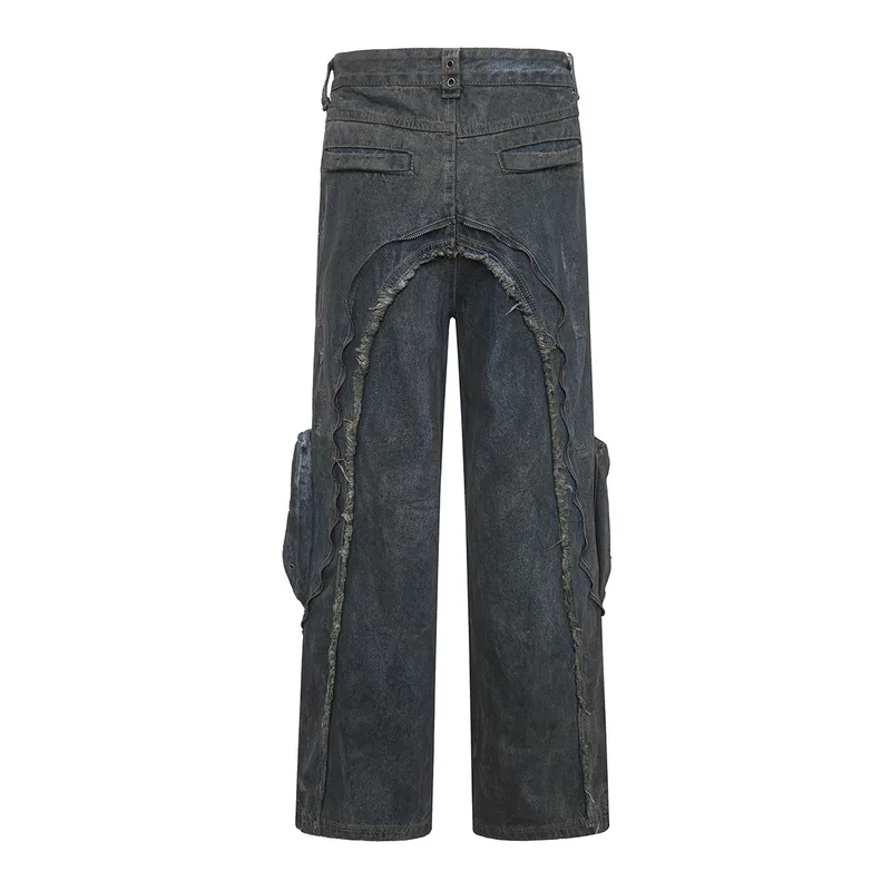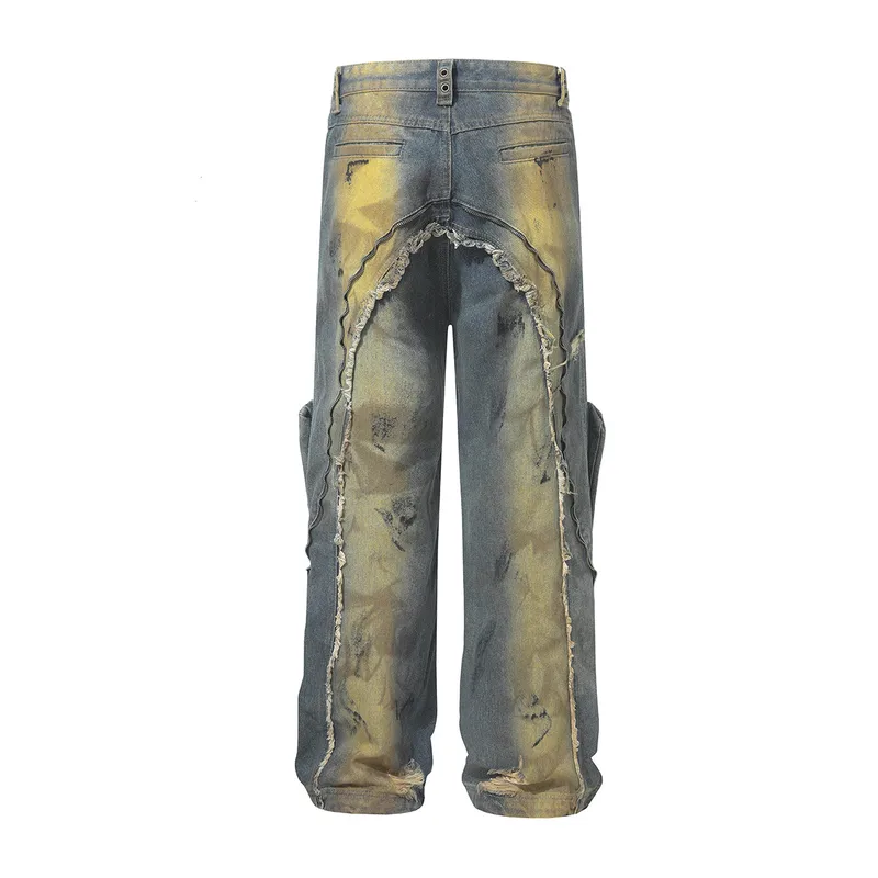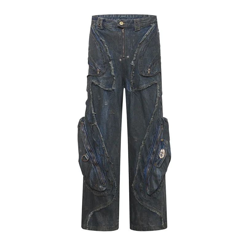 Jiayi Library Men's New High Street American Style Heavy Industry Shaped Jeans Men's Waste Soil Wind Washed Workwear Trousers