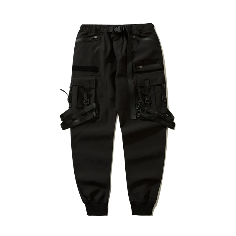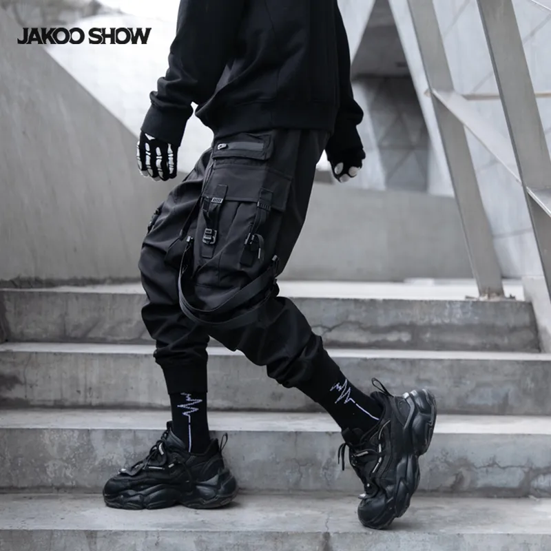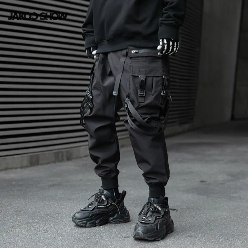 Wholesale Jiayiku men's clothing Chinese fashion functional ribbon overalls dark concealed tactical multi-pocket ankle-tied pants