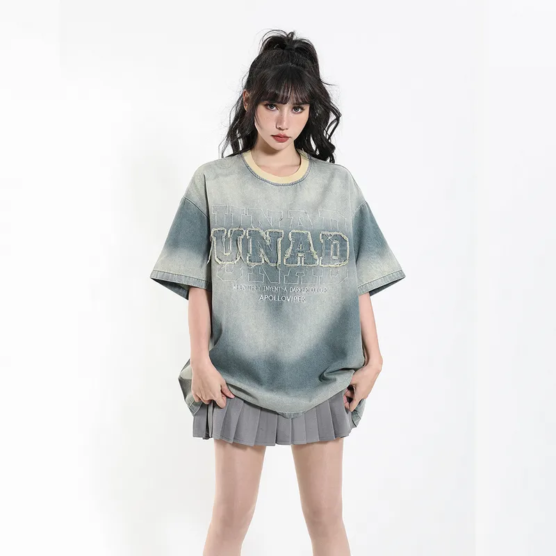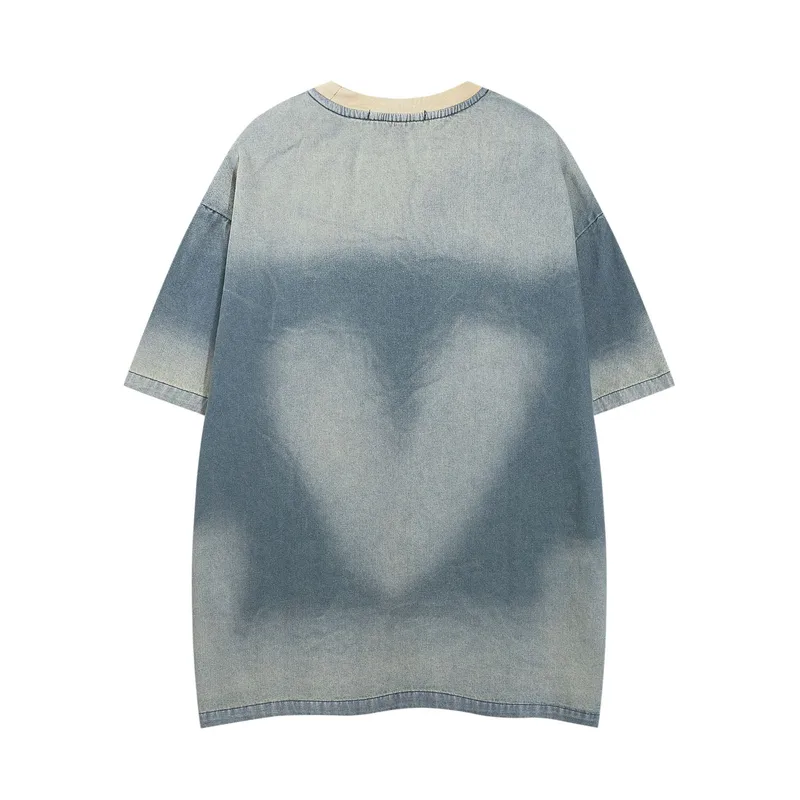 Jiayiku Men's Clothing Polo American Street Fashion Brand T-shirt Denim Washed Distressed Spray Horse Polo Embroidered Short-sleeved T-shirt