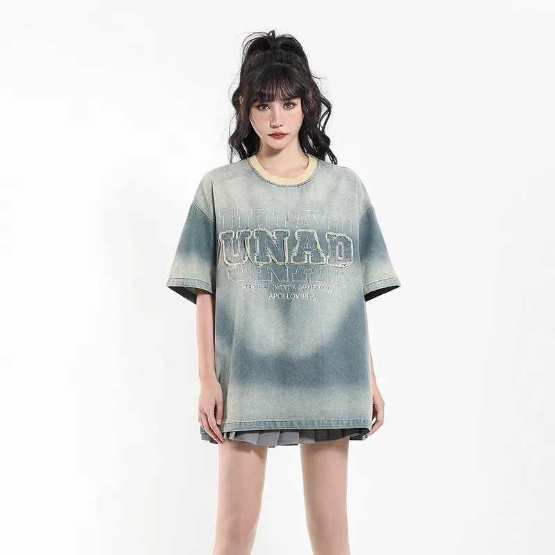 Wholesale Jiayiku men's clothing Polo American street fashion brand T-shirt Denim washed distressed spray horse polo embroidered short-sleeved T-shirt