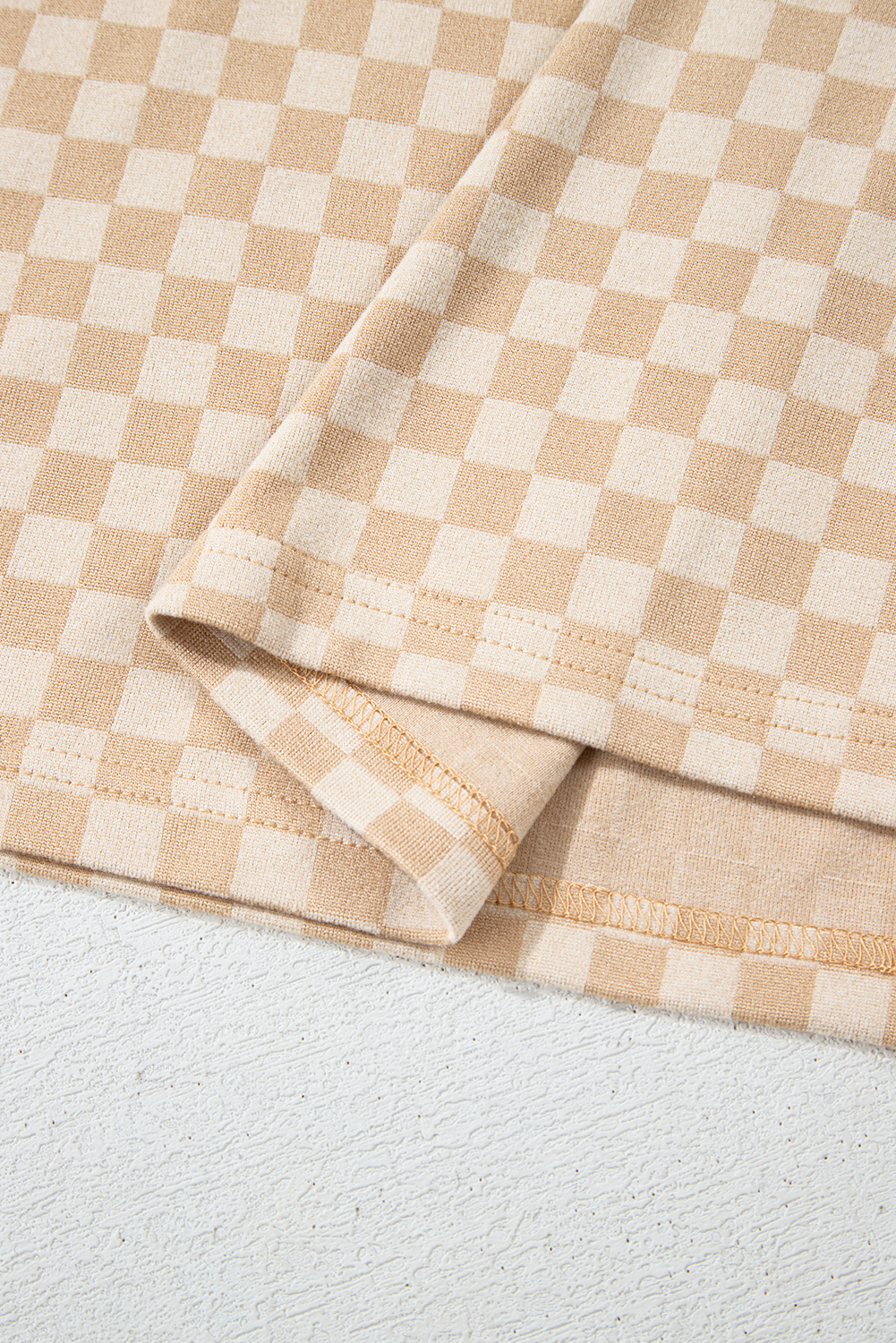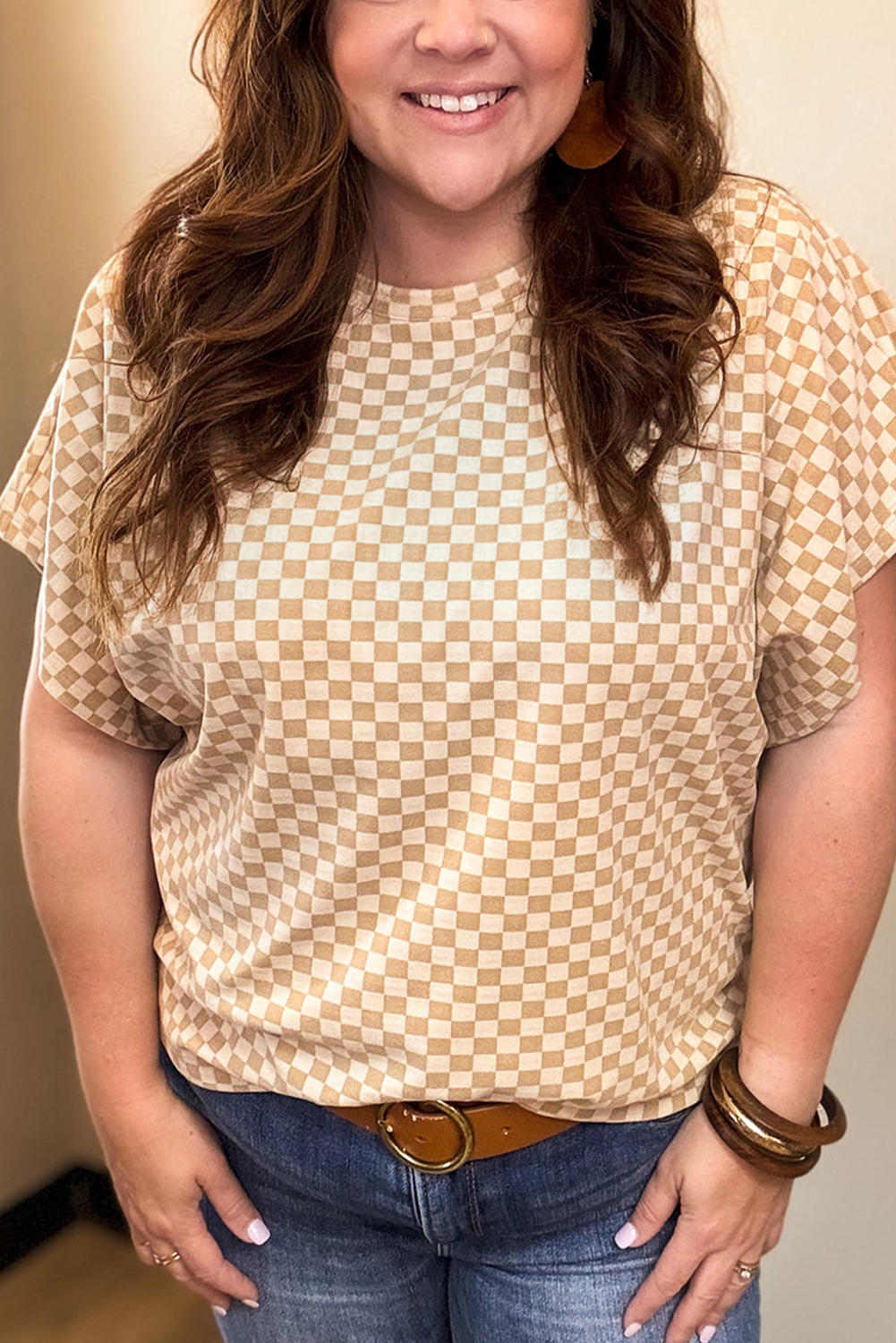 Khaki Checkerboard Short Batwing Sleeve Round Neck Plus Size T Shirt
