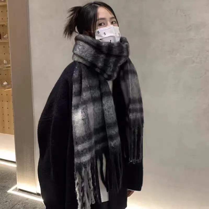 Korean Style Plaid Tassel Mohair Scarf Women's Spring Japanese Students Travel Fashionable Sticker Casual Scarf