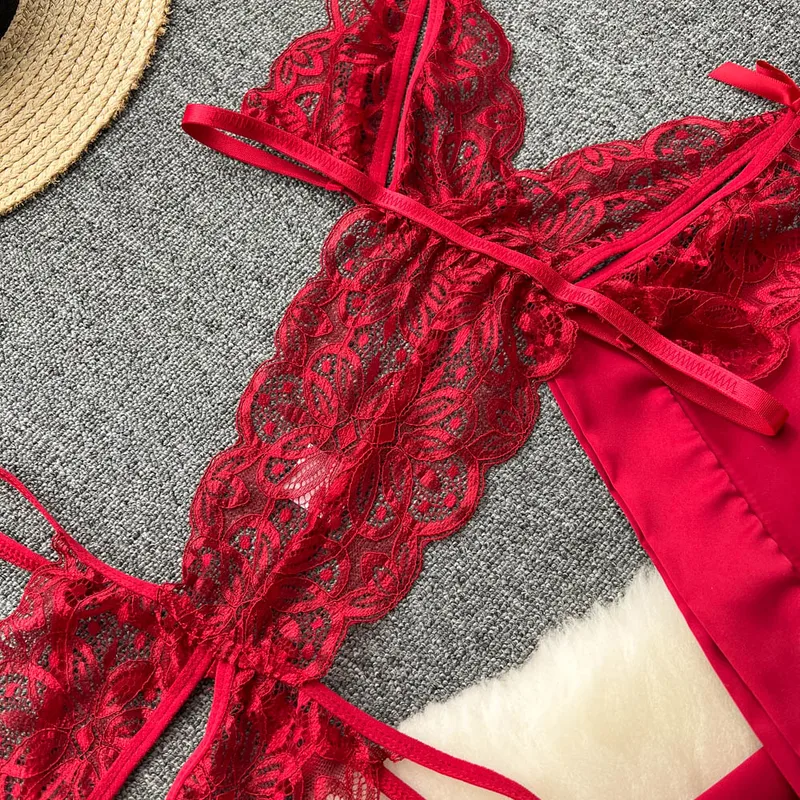 Wholesale lace lace bras sexy lace hollow out low waist crotch opening sexy lingerie pajamas