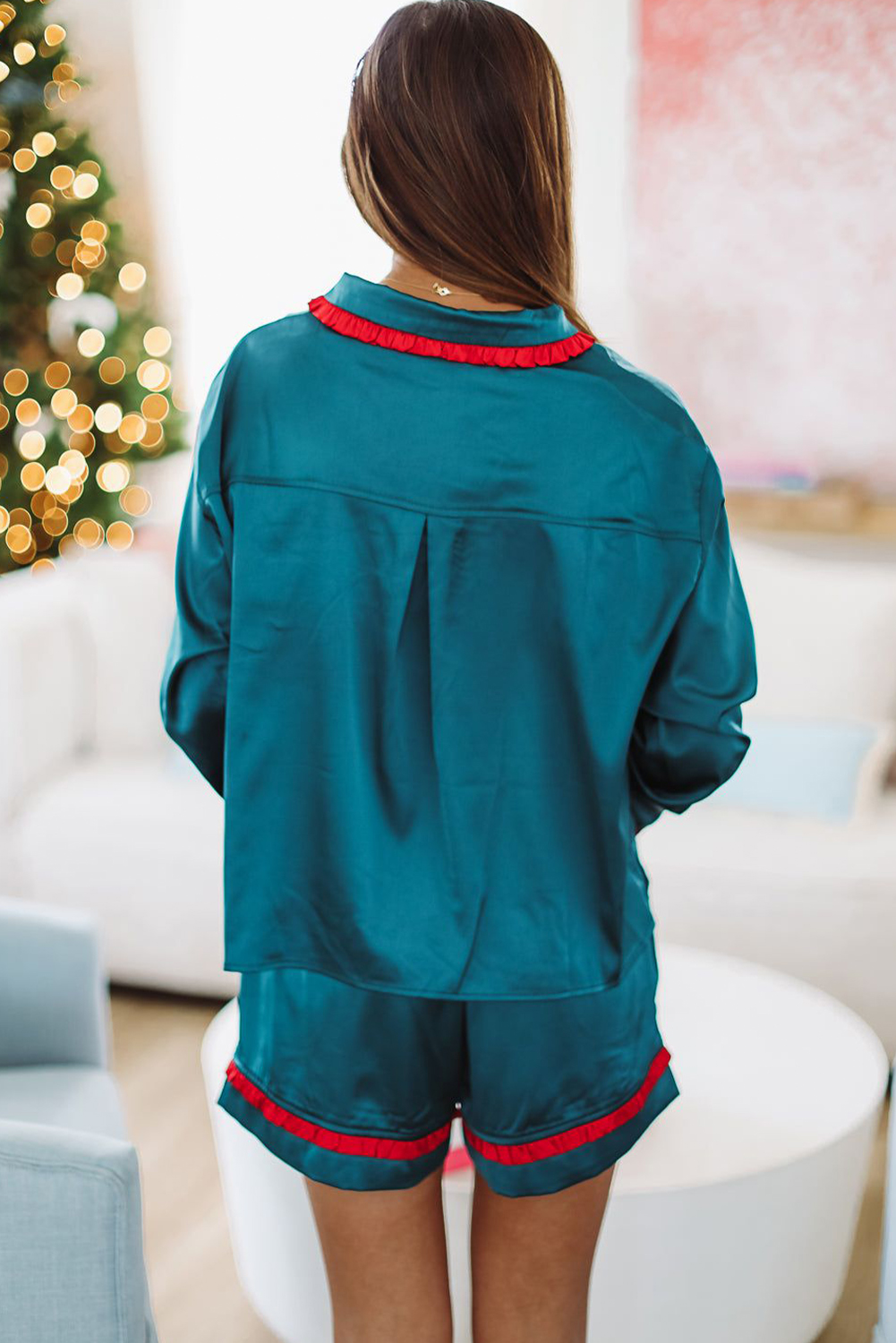 Lapis Contrast Frilled Trim Ribbon Bow Knot Short and Top Pajama Set