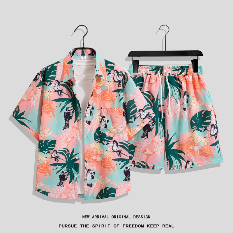Wholesale Men's Quick-Dry Floral Hawaiian Shirt & Shorts Set - Summer Beach Casual Loose Fit Two-Piece Outfit