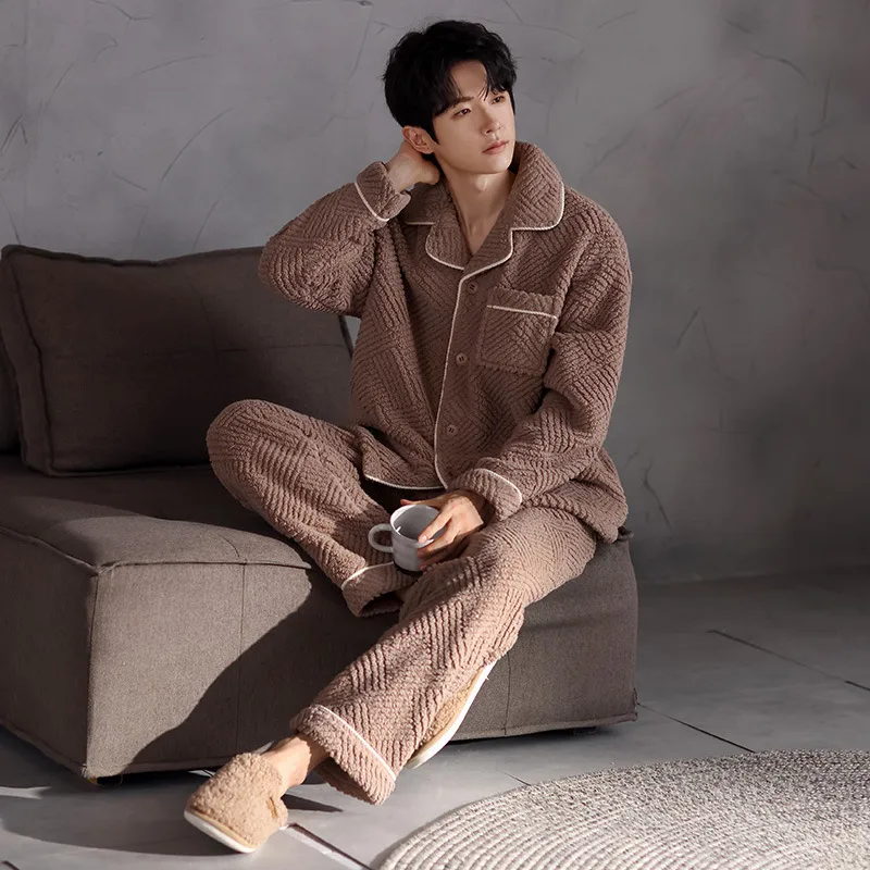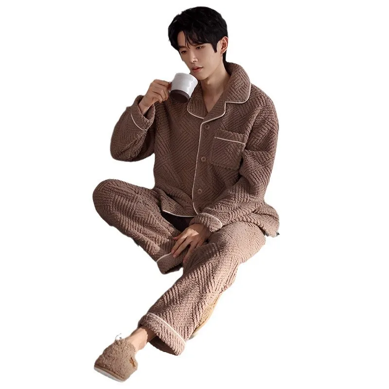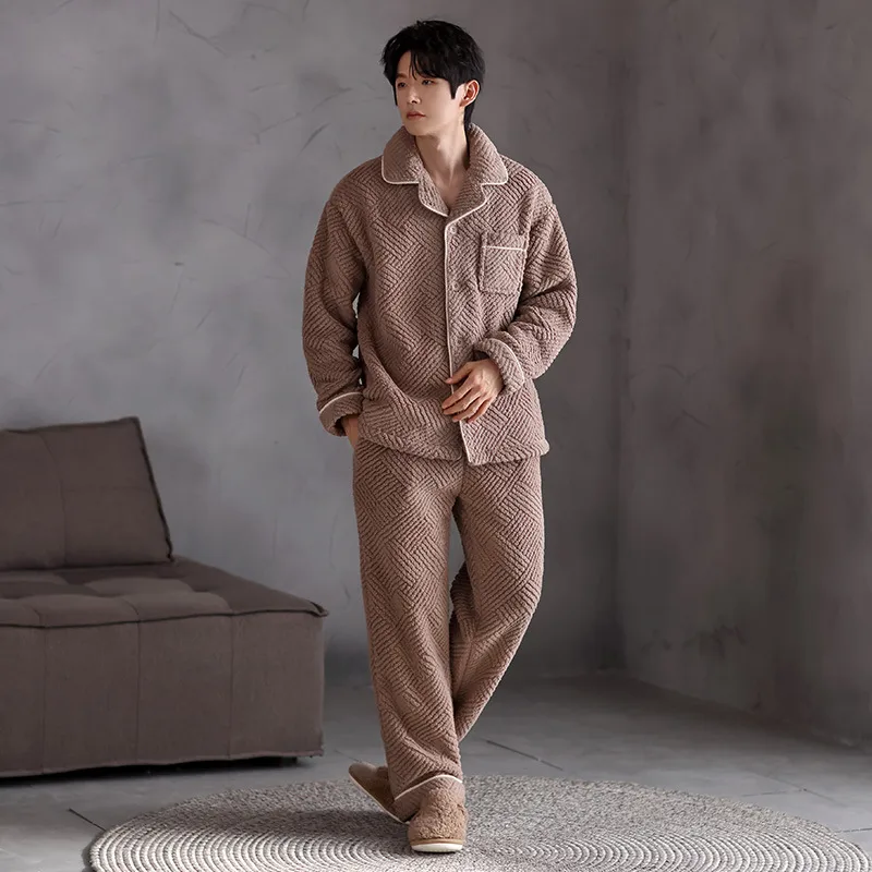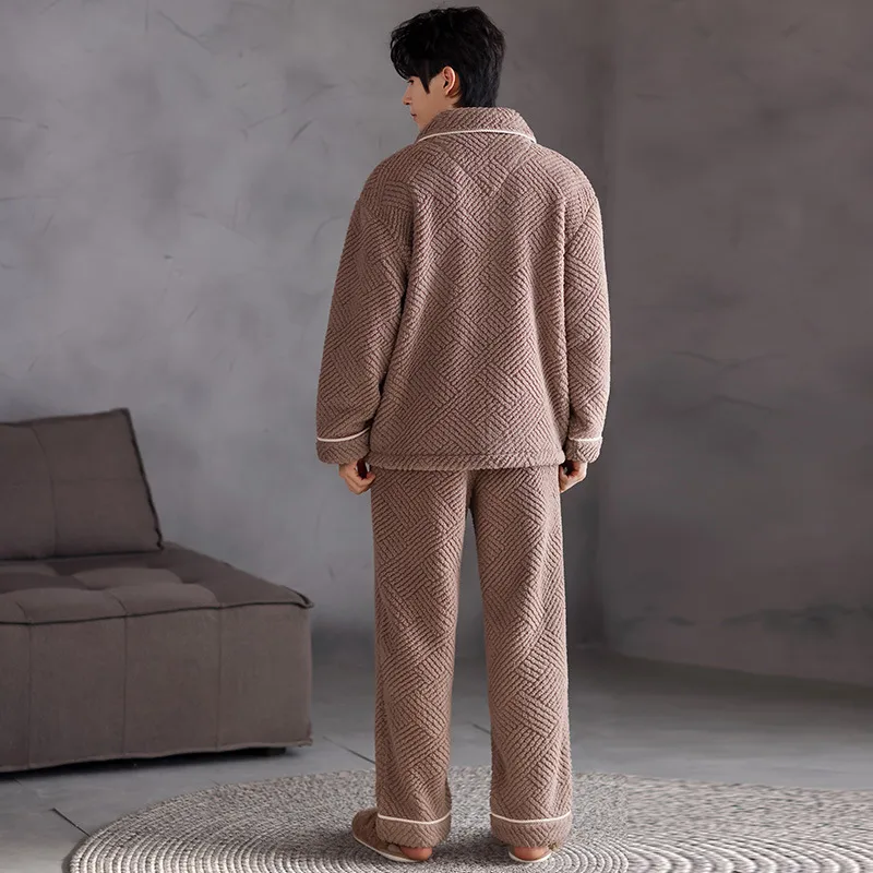Men's Winter Thermal Flannel Sleepwear Set, Thickened Fleece - Lined Long Sleeve Pajamas, Cozy Home & Outdoor Lounge Wear