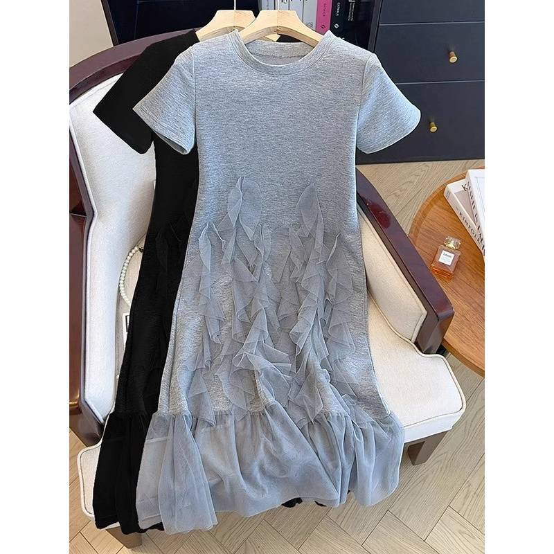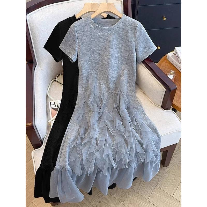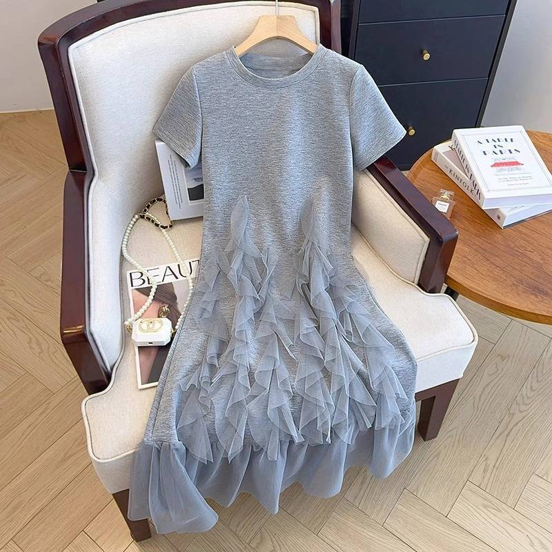 Mesh Stitching Summer Short-sleeved New Arrival Skirt Grey Fashionable Elegant Mid-long Chubby Large Size Dress