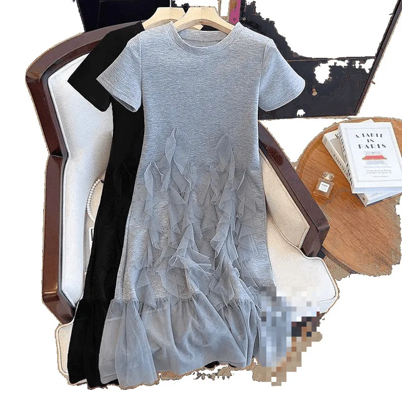 Wholesale Mesh Stitching Summer Short-sleeved New Arrival Skirt Grey Fashionable Elegant Mid-long Chubby Large Size dress