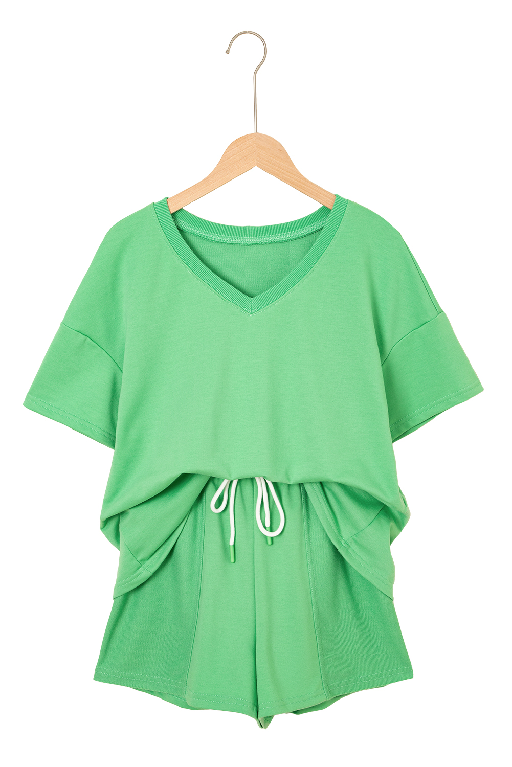 Mint Green V Neck Drop Shoulder Tee and Patchwork Drawstring Elastic Waistband Shorts Set