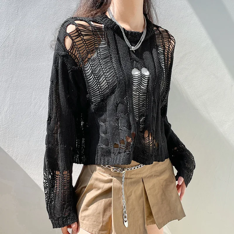 Wholesale New Style Hollow Knitted Design Women's Blouse for Spring and Autumn See-through Sexy Spice Girl Wool Top
