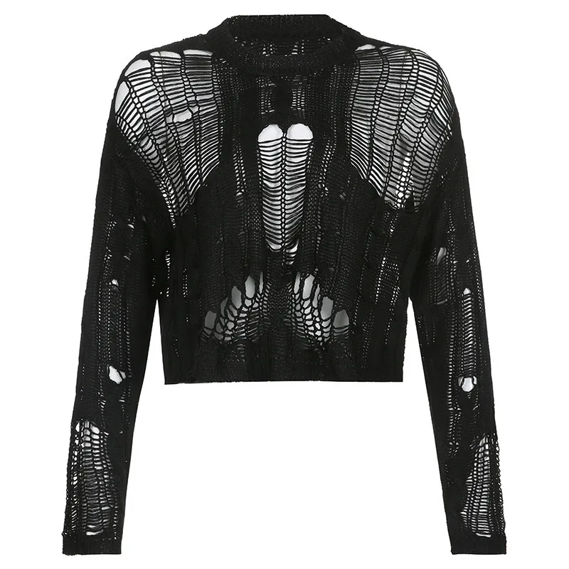 New Style Hollow Knitted Design Women's Blouse For Spring And Autumn See-through Sexy Spice Girl Wool Top