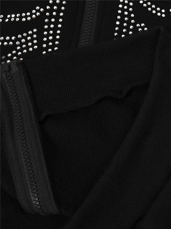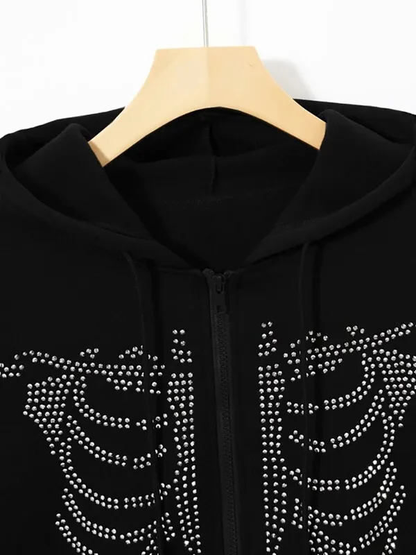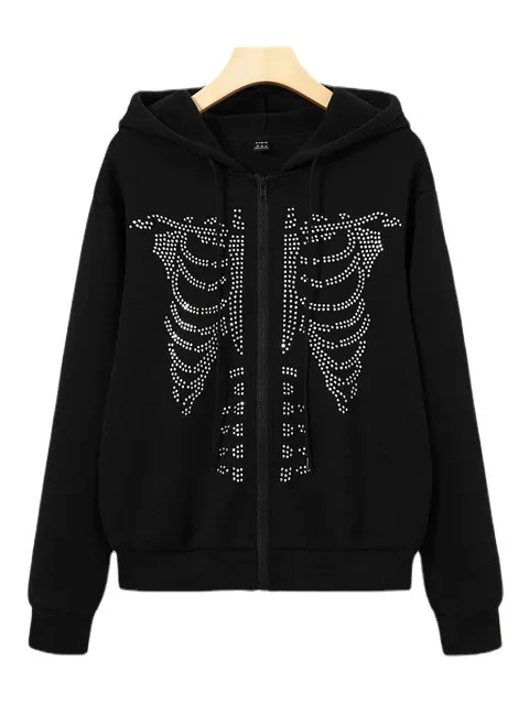 New Y2k Skeleton Rhinestone Pattern Zipper Drawstring Hoodie Street Harajuku Hooded Sweater