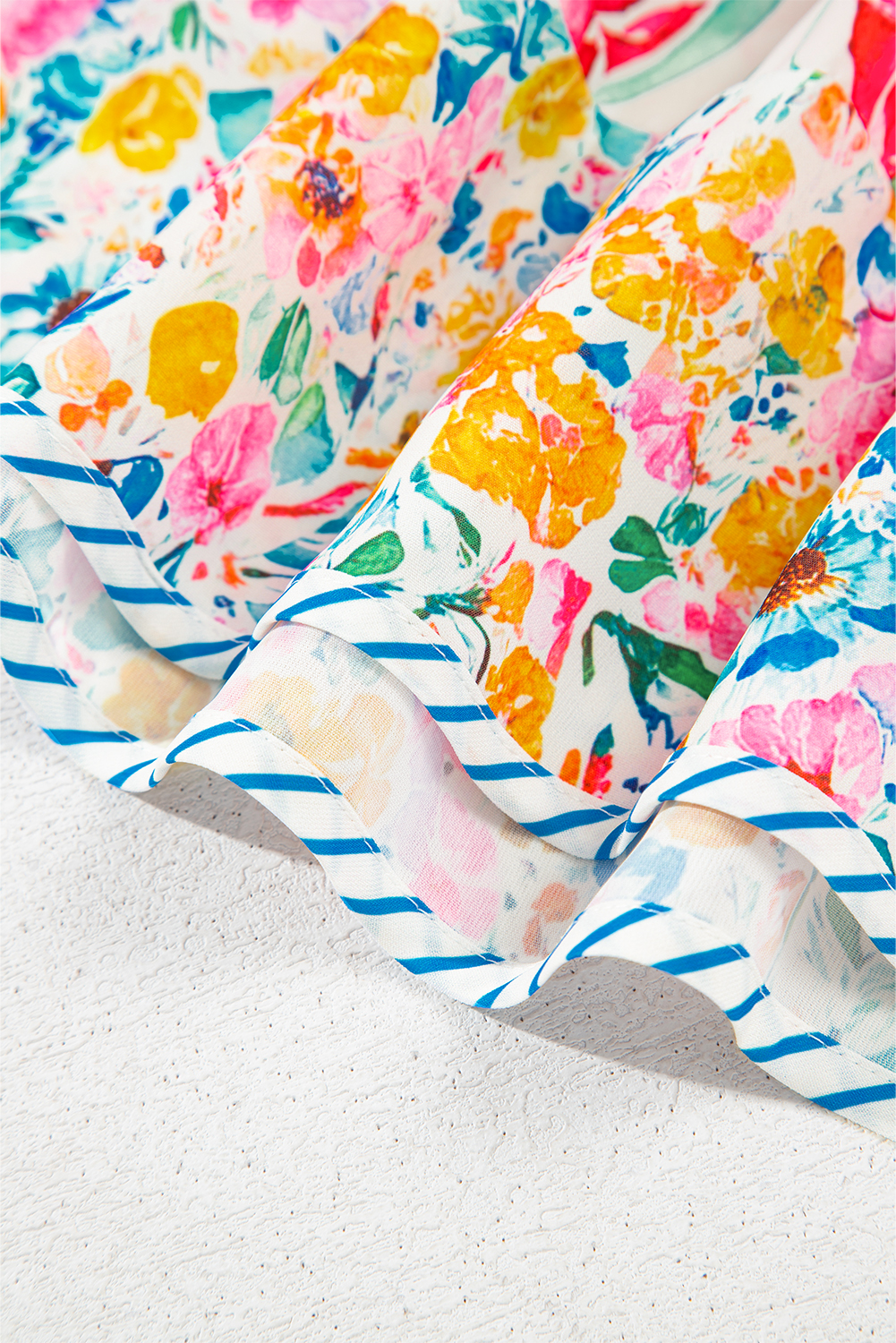 Pink Floral Print Striped Detail Split Neck Short Sleeve Blouse