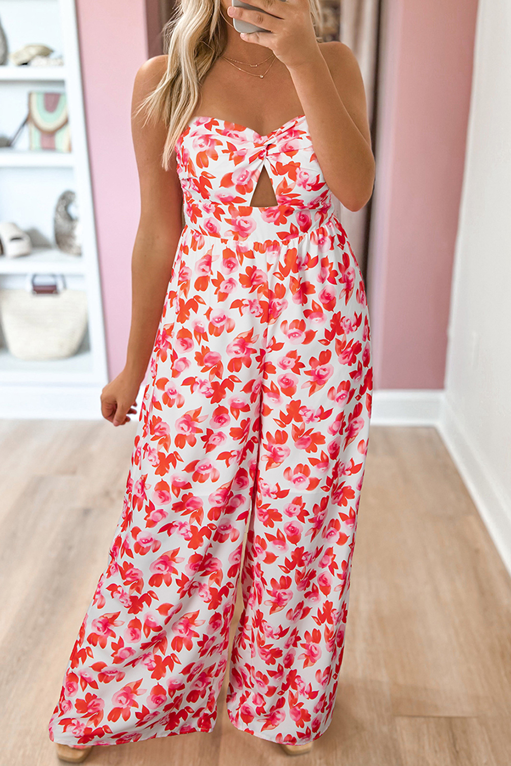 Pink Floral Print Twisted Bandeau Keyhole Pleated Wide Leg Jumpsuit