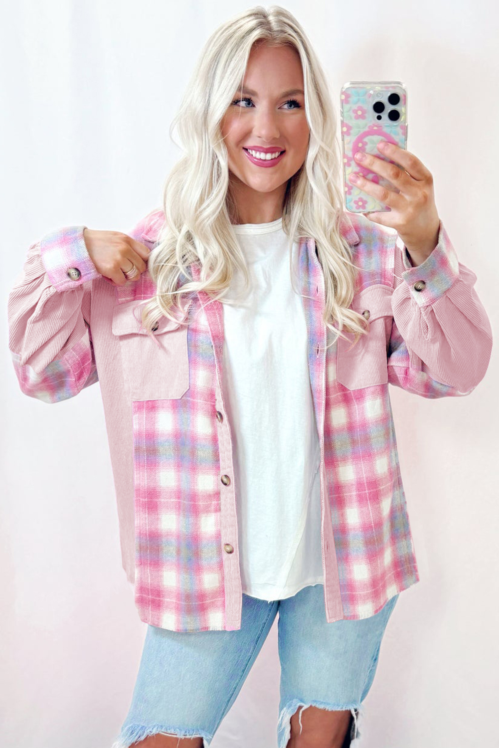 Pink Brushed Plaid Corduroy Flap Pockets Patchwork Shacket