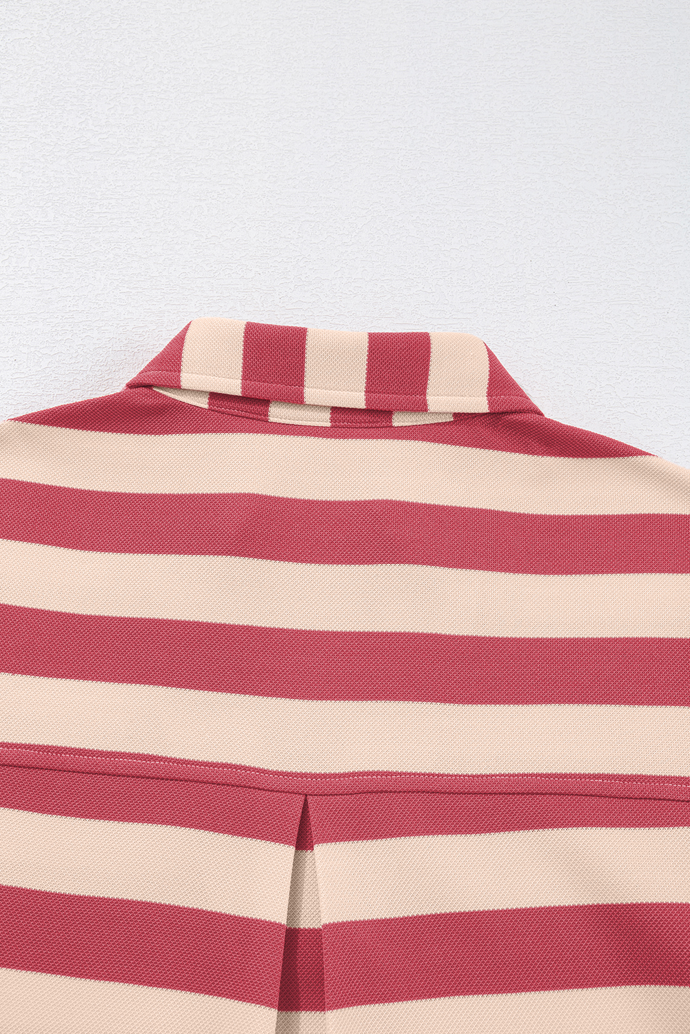 Pink Stripe Collared V Neck Long Sleeve Loose Casual Dress