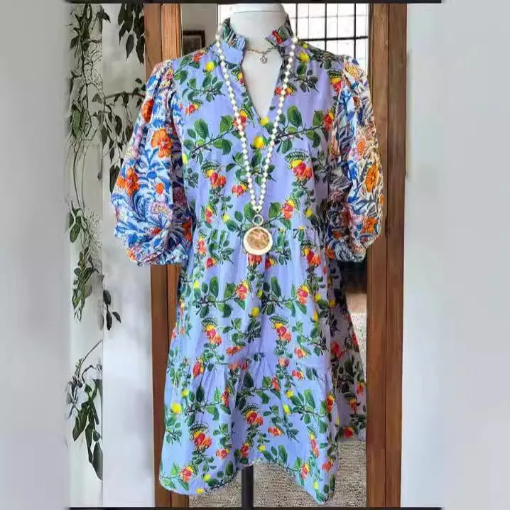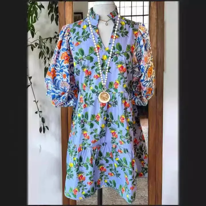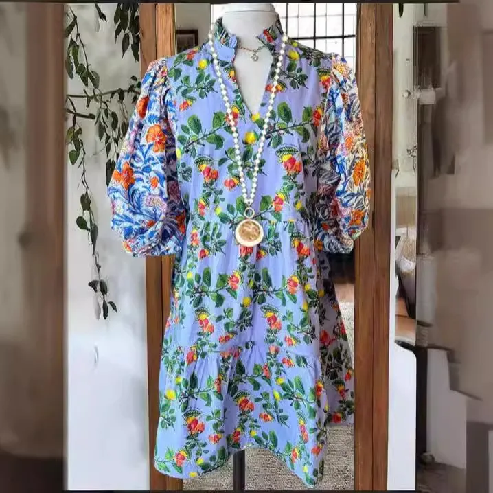 Wholesale Printed dress foreign trade French commuter style retro crepe v-neck floral dress