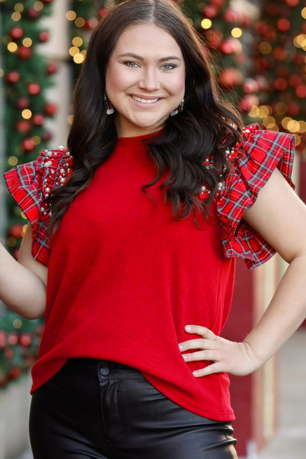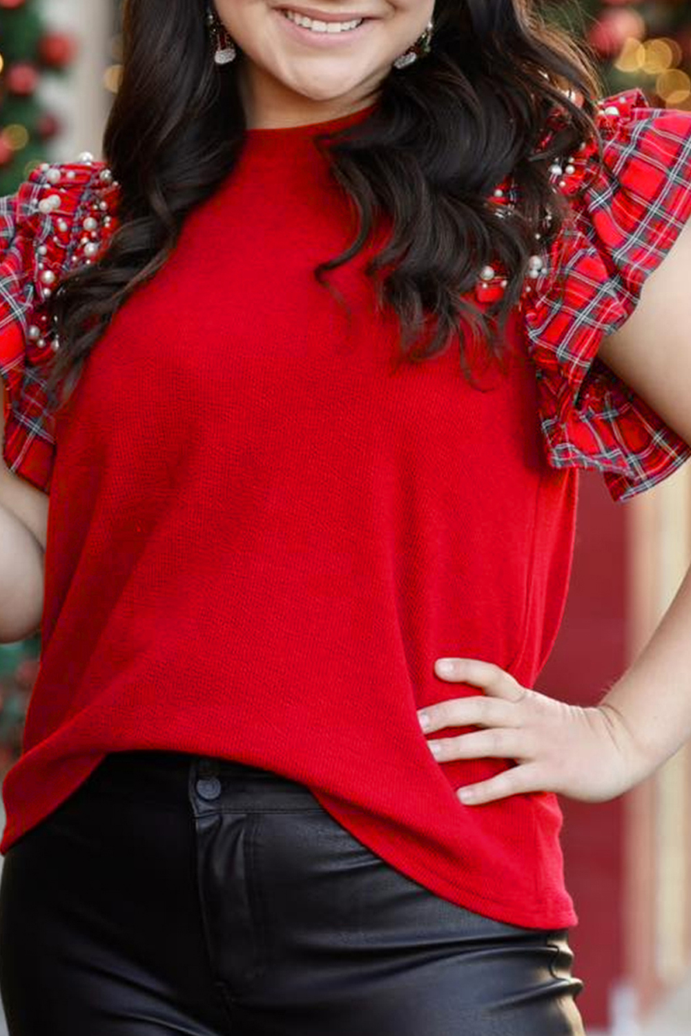 Racing Red Plaid Pearl Knitted Christmas Holiday Plus Size T-shirt
