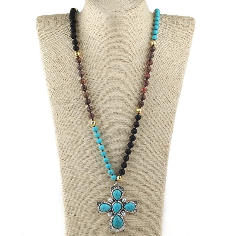 Retro Bohemian Cross Natural Stone Beaded Chain Pendant Necklace In Bulk Natural Stone Necklace