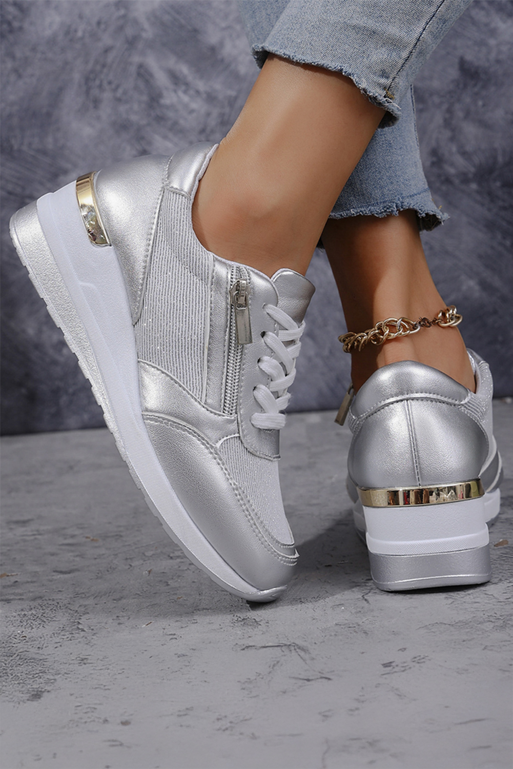 Silvery PU Leather Patchwork Zipper Lace-up Sneakers