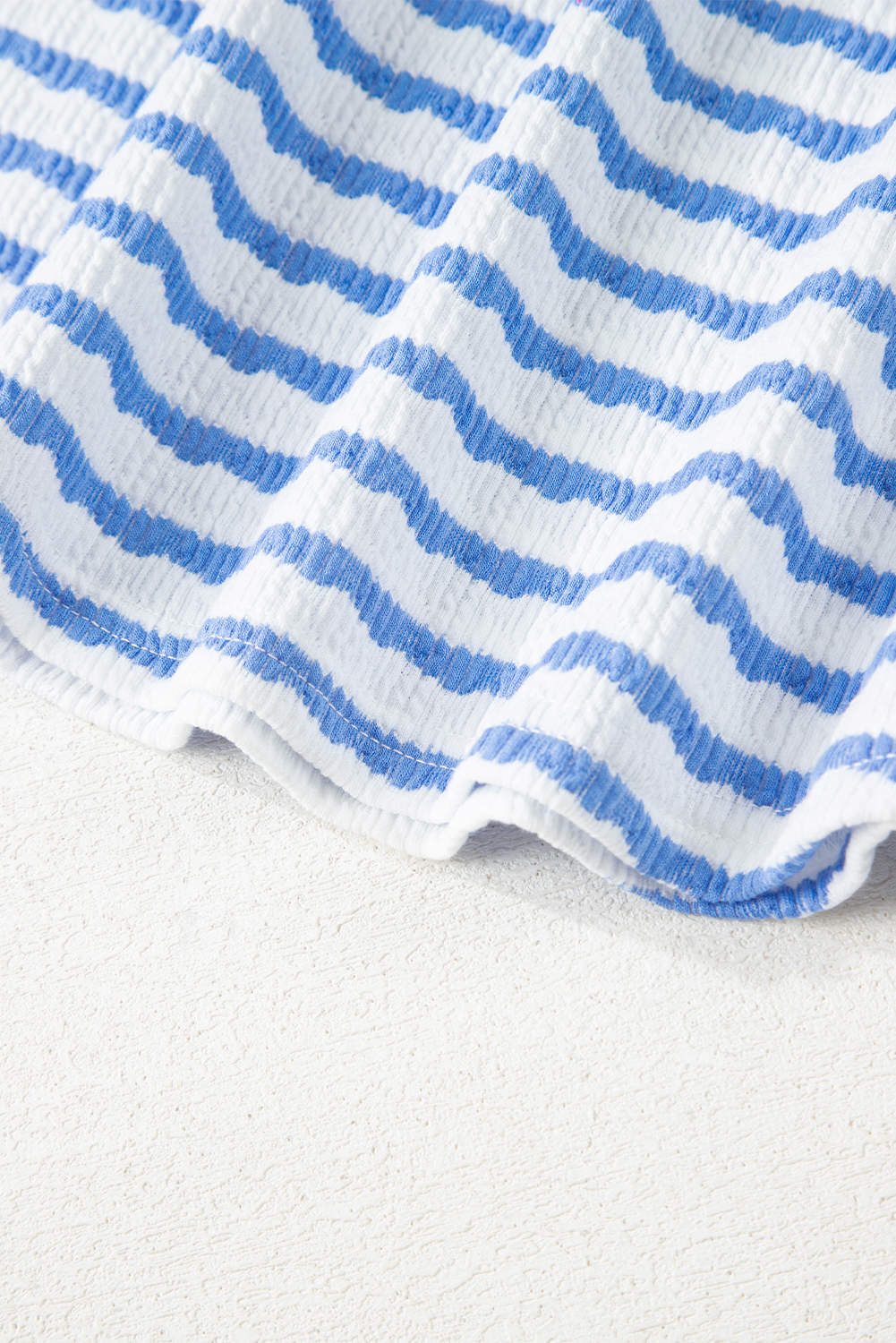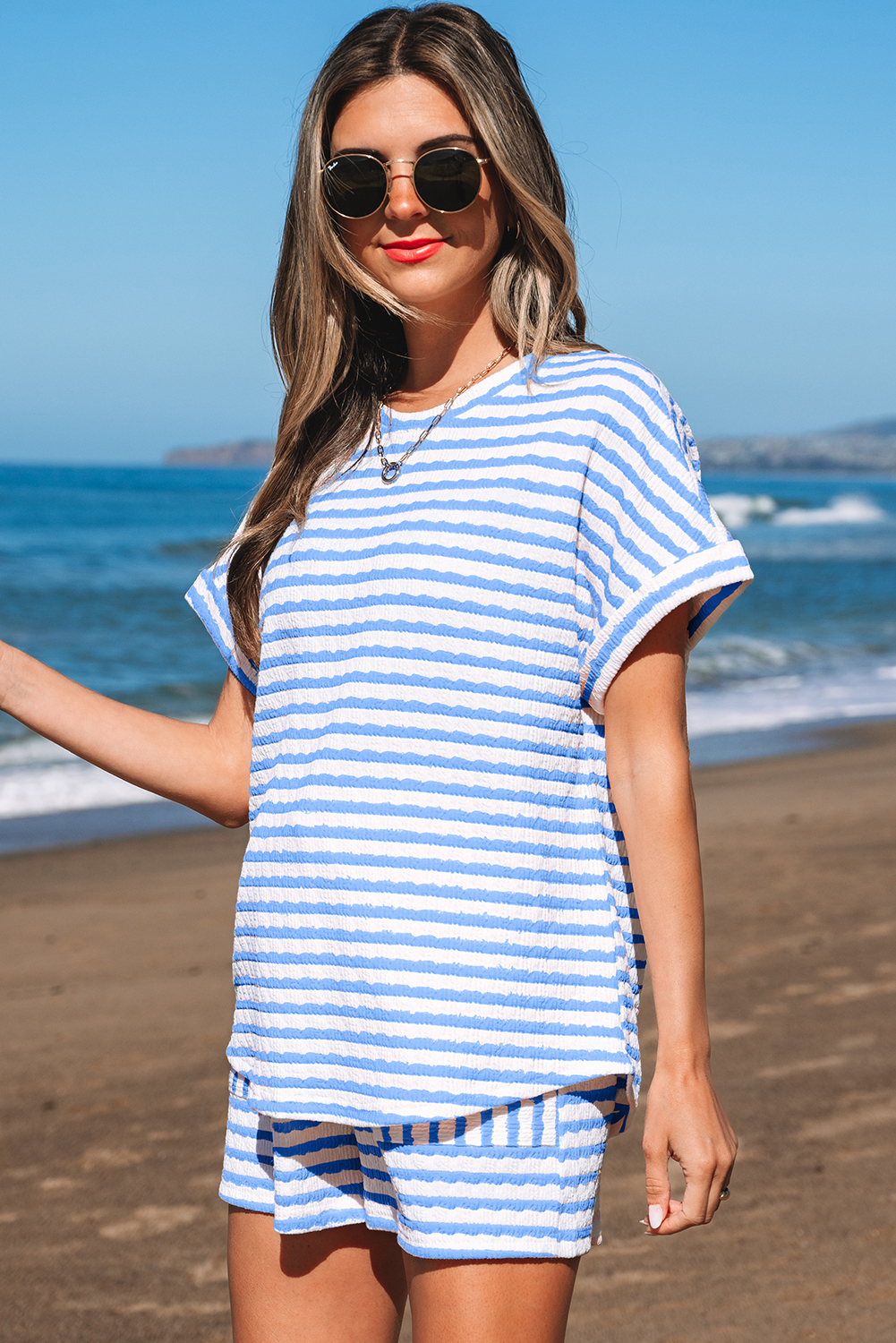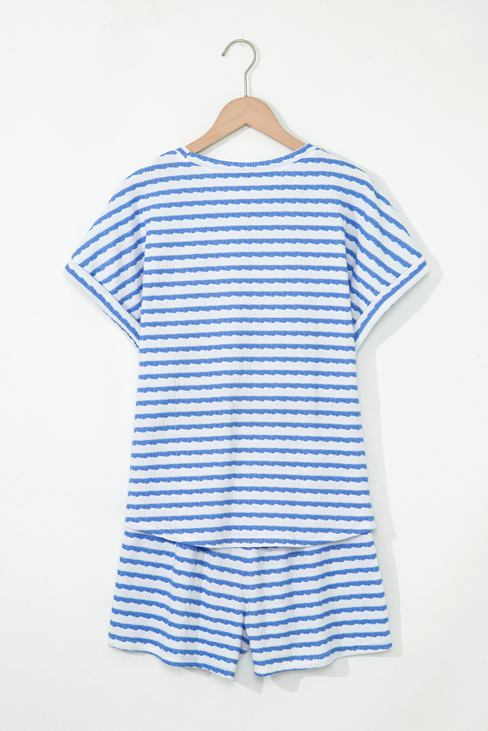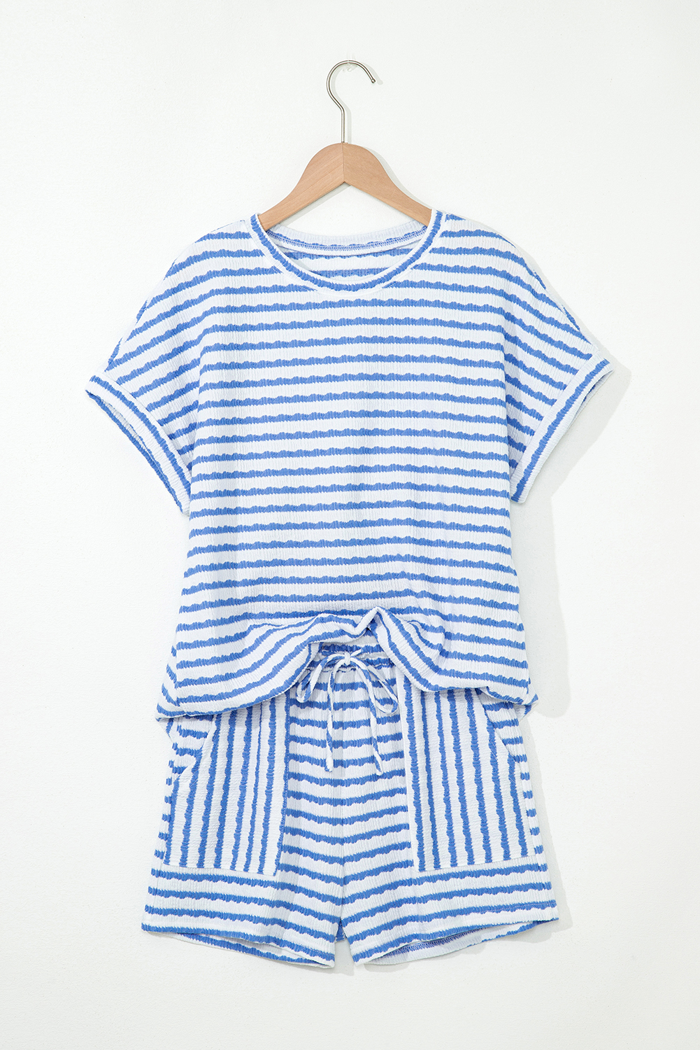 Sky Blue Stripe Knitted Short Sleeve Top and Drawstring Shorts Set