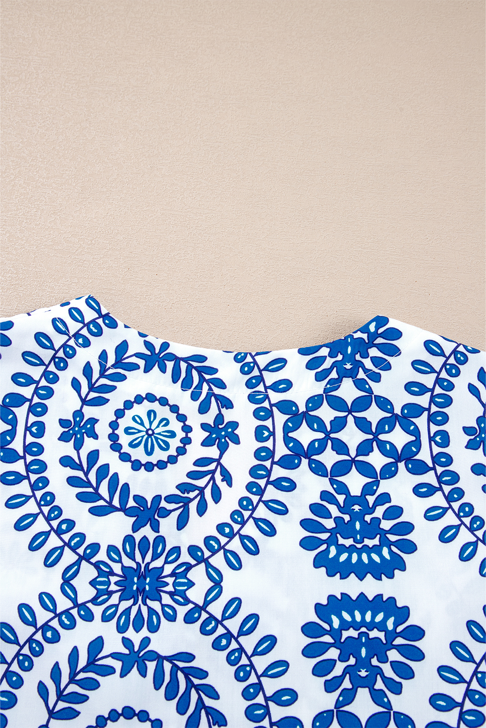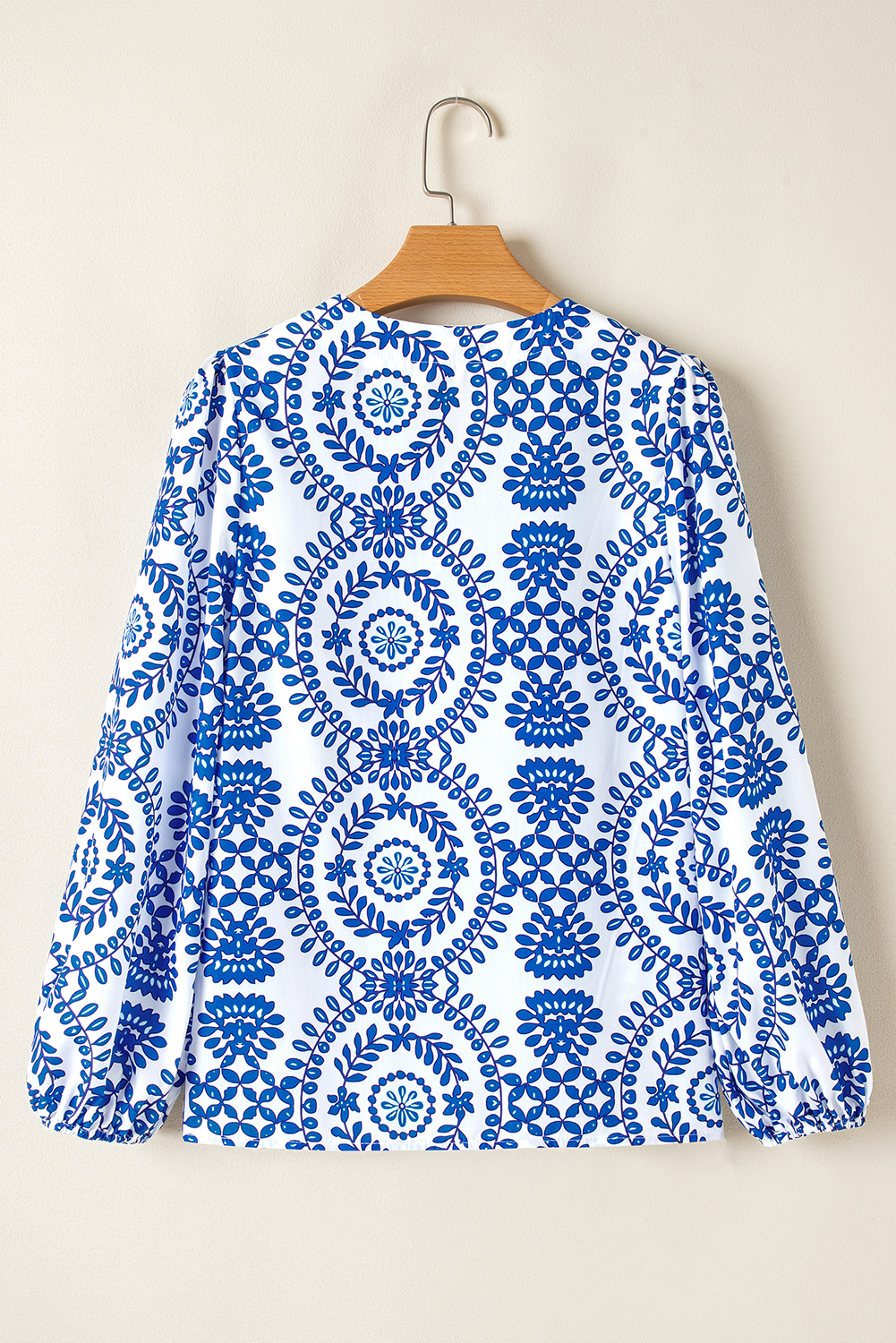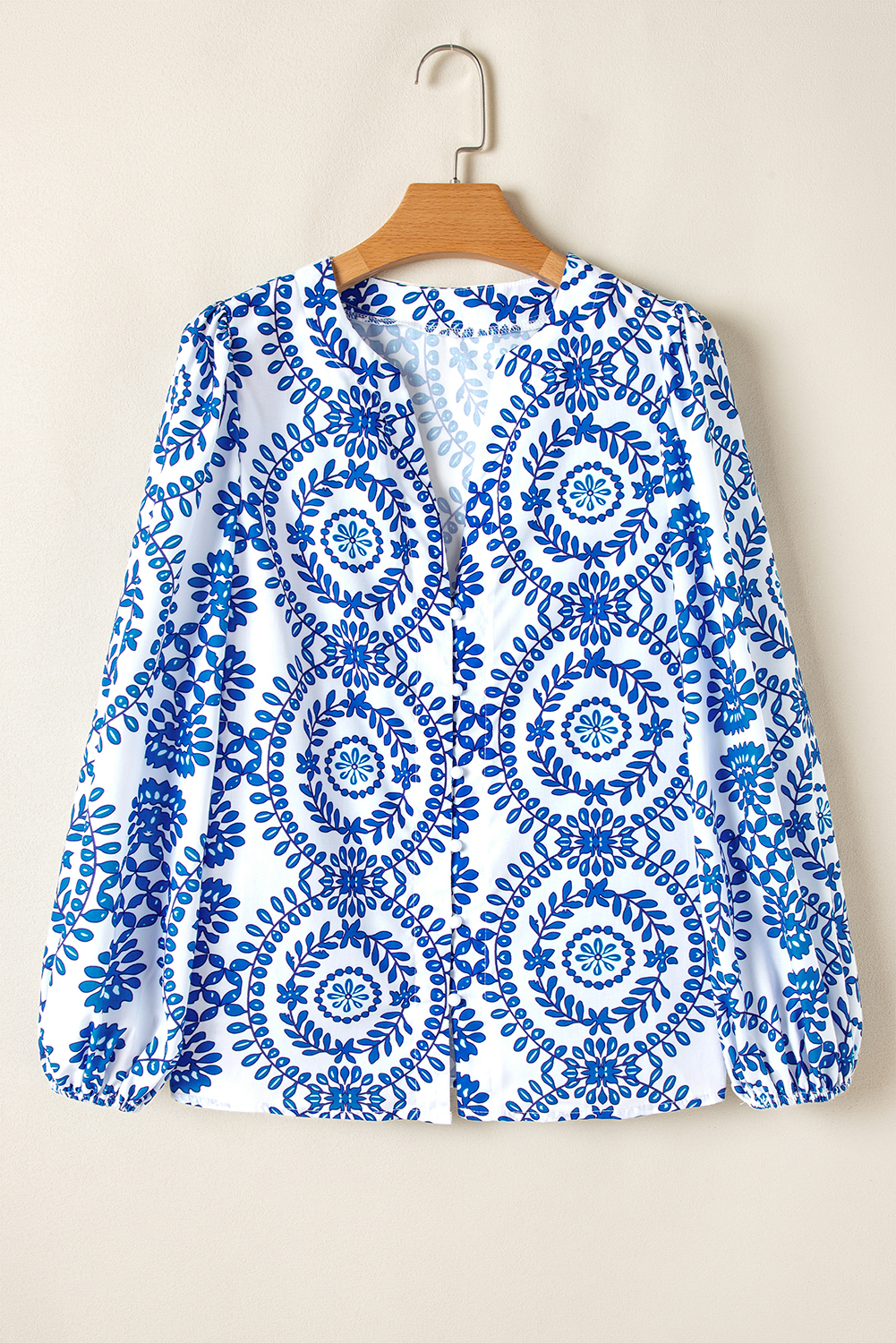 Sky Blue Vintage Geometric Printed Puff Sleeve Slit V Neck Shirt