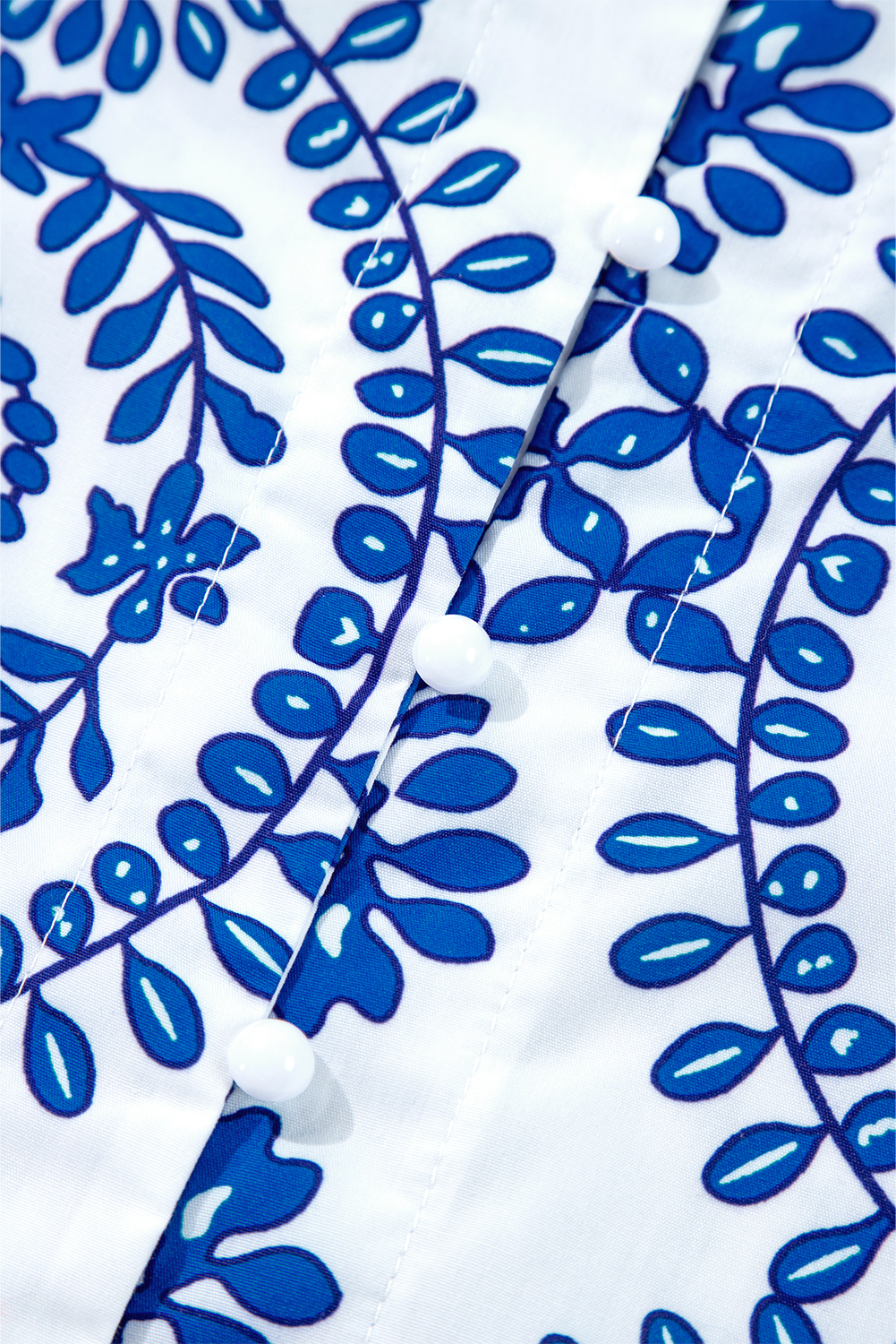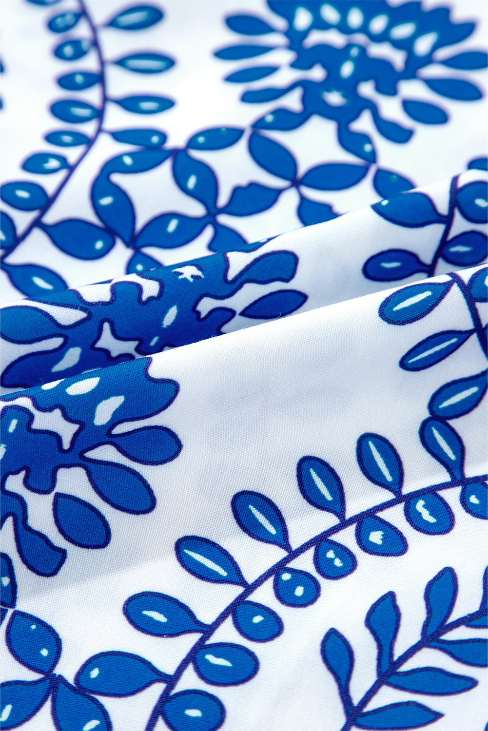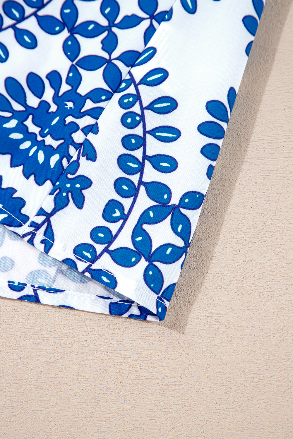 Sky Blue Vintage Geometric Printed Puff Sleeve Slit V Neck Shirt