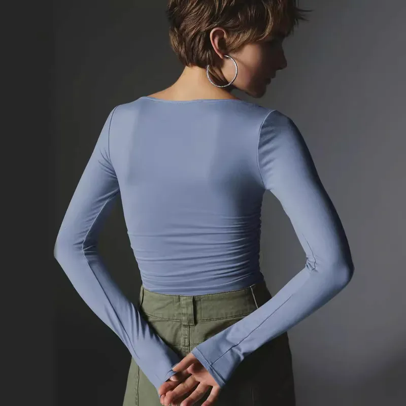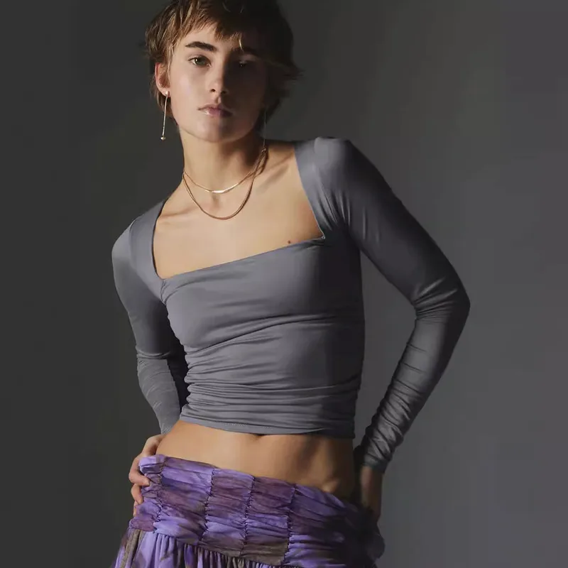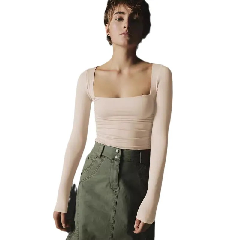 Spot Wholesale Hot Summer Women's Long Sleeve Square Collar Slim Top Fashion Solid Color All-match High-end Women's Clothing