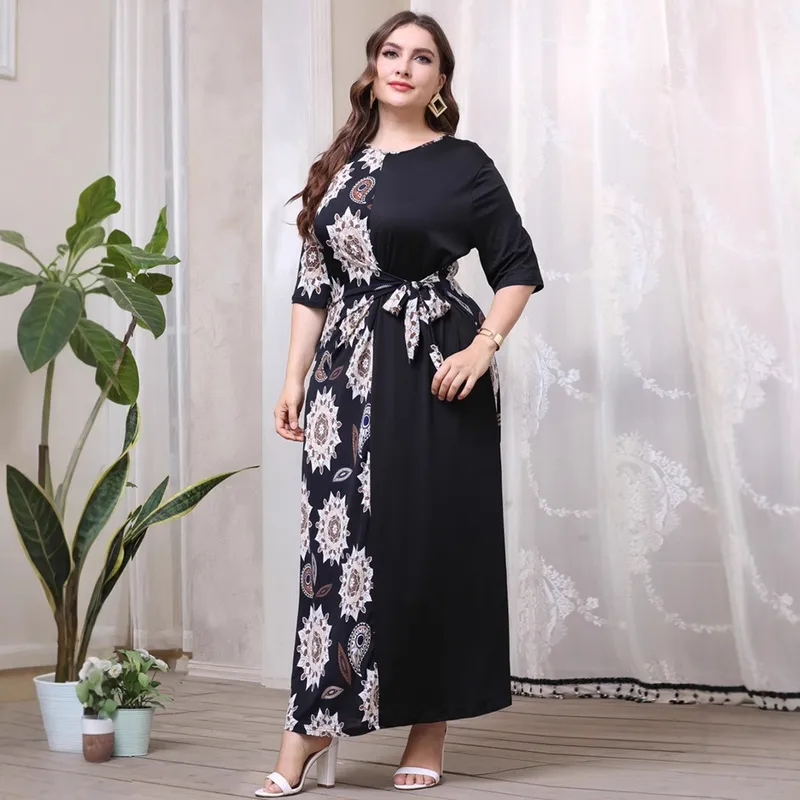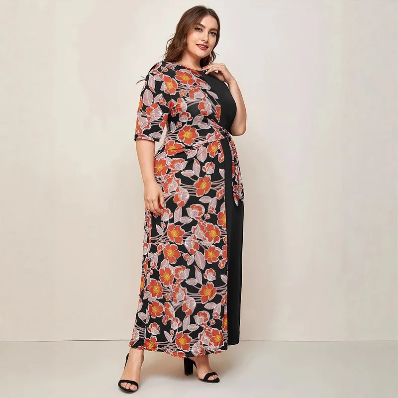 Wholesale Spring and Summer Large Size Women's Fashion Printed Stitching Loose Large Swing Dress Long Dress 6451