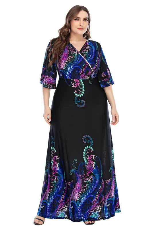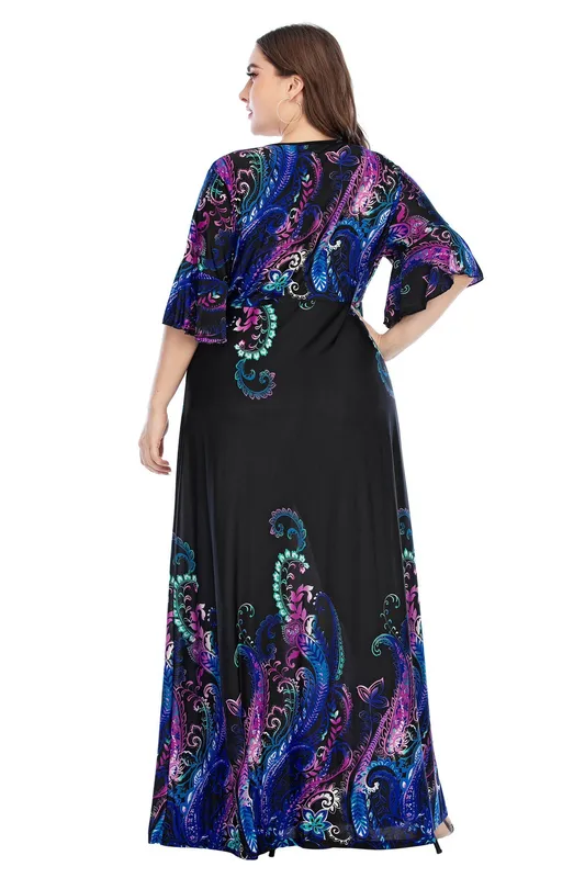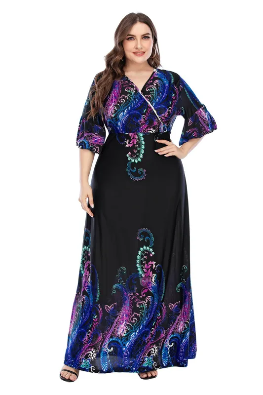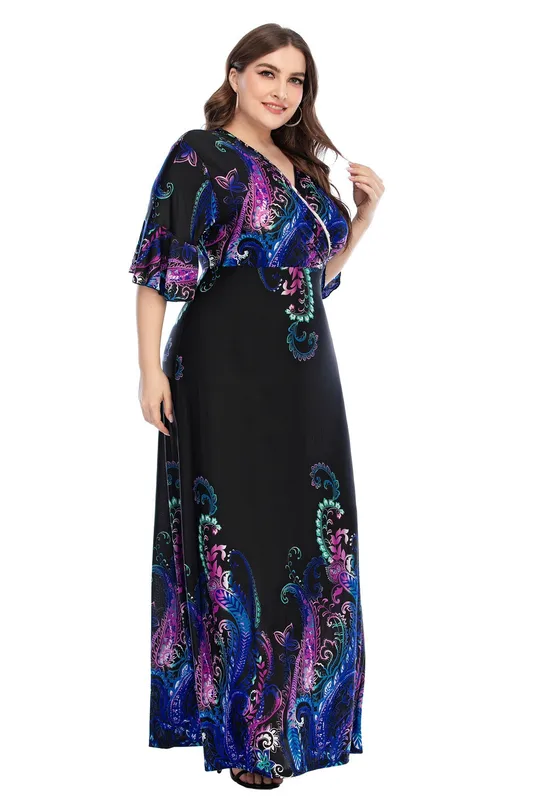 Wholesale Summer New Large Size Fashion Printed Dress Bohemian V-neck Long Dress 5096